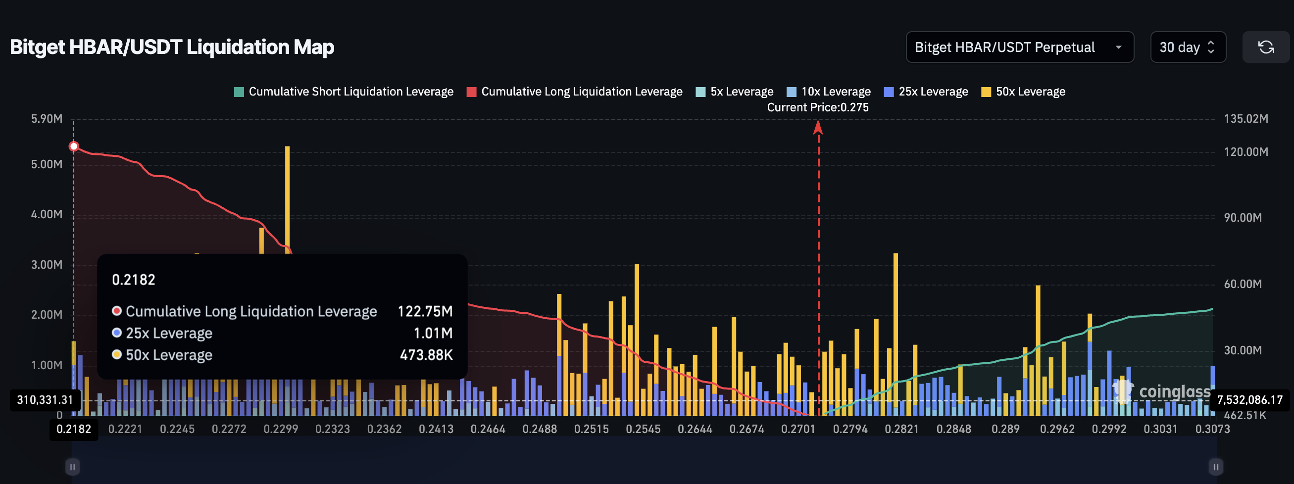 El mapa de liquidación de Bitget muestra que el apalancamiento largo supera ampliamente a los cortos (122,75 millones de dólares frente a 49 millones de dólares), lo que significa que el mercado todavía está posicionado al alza. Este sesgo agrega riesgo: si el precio cae, los grupos de liquidación cerca de 0.2182 dólares podrían acelerar la venta.