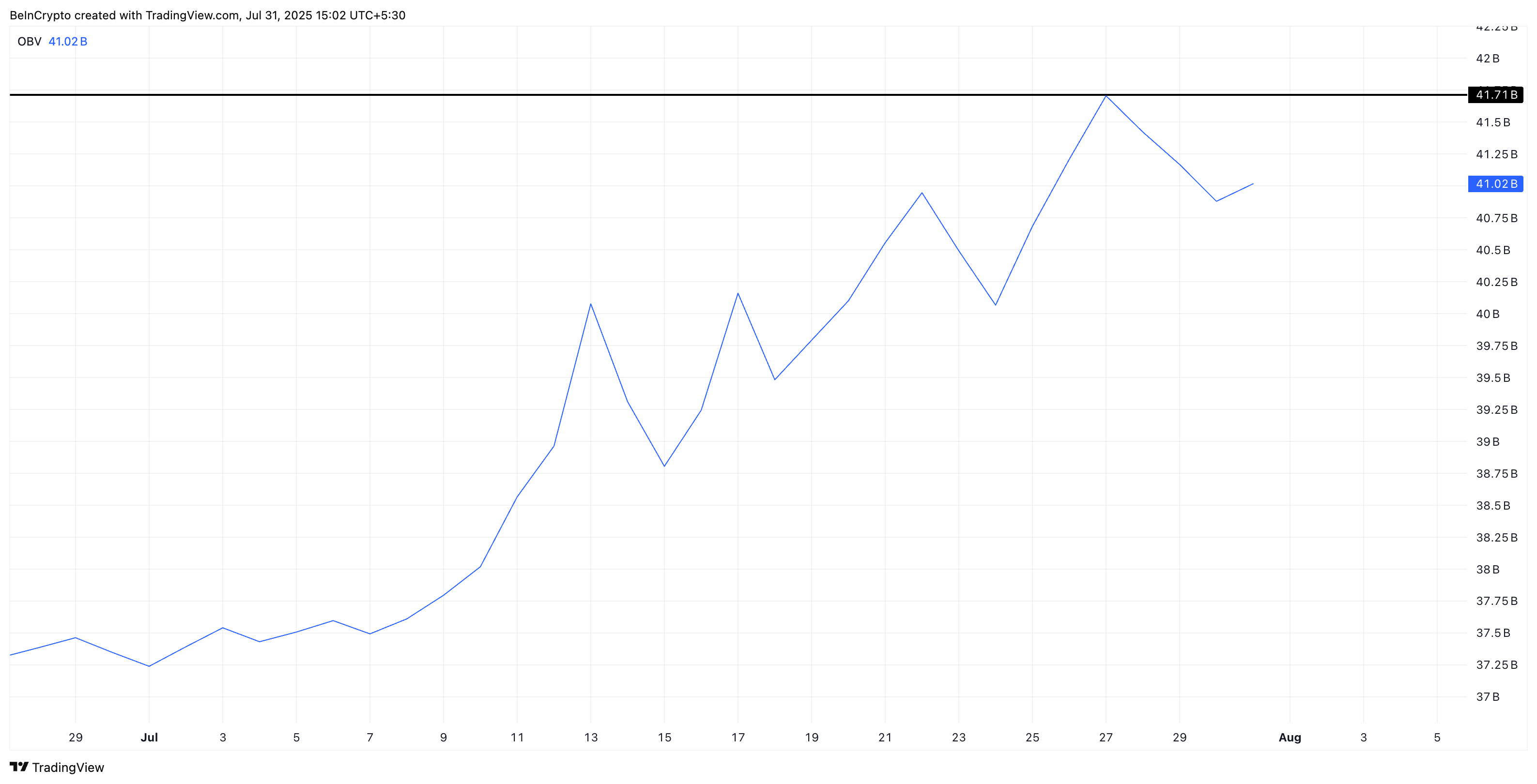 Sin embargo, aunque el OBV está alcanzando máximos más altos, necesita mantenerse por encima de la marca de 41,71 mil millones para sostener el momentum del precio de HBAR en agosto.