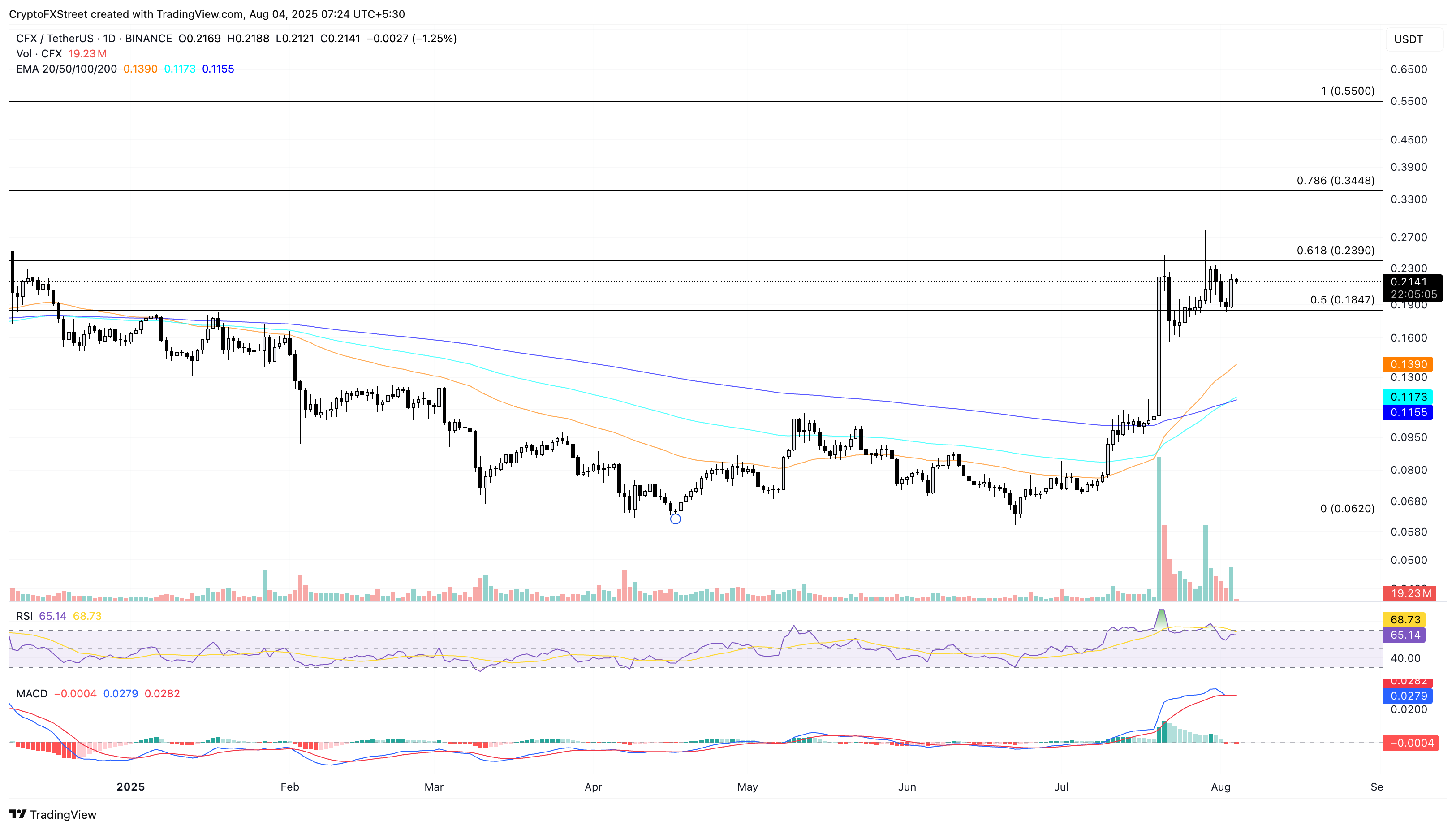 Conflux ganó más del 15% el domingo al rebotar desde el nivel de retroceso del 50% en 0.1847$, trazado desde 0.5500$ el 24 de marzo hasta 0.0620$ el 17 de abril. CFX baja más de un 1% en el momento de la publicación el lunes, manteniendo una tendencia lateral por debajo del nivel de Fibonacci del 61.8% en 0.2390$.