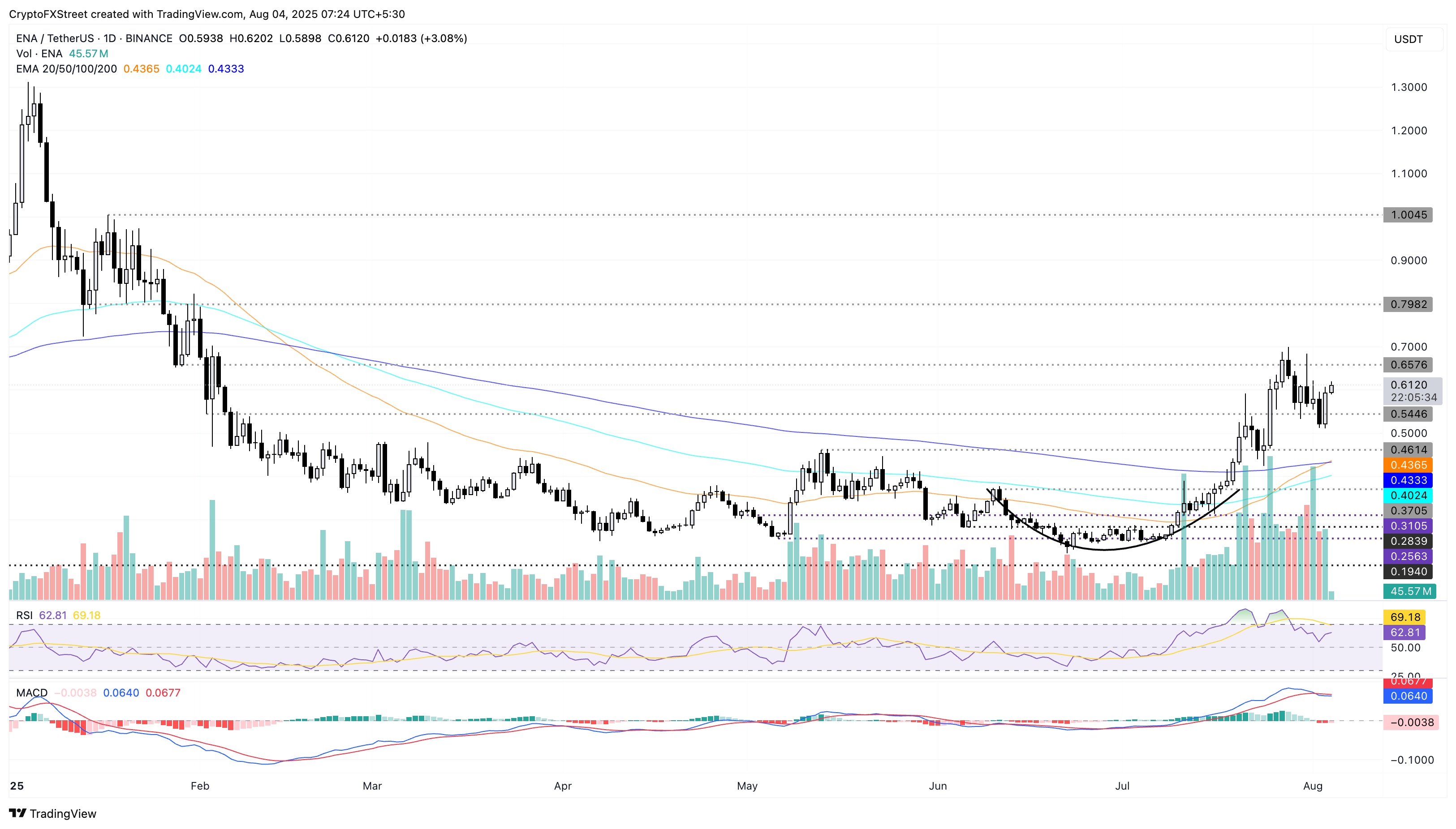 Ethena se mantuvo por encima del nivel psicológico de 0.50$ con un aumento de casi el 14% el domingo. En el momento de escribir el lunes, ENA avanza más de un 2%, acercándose al máximo de la semana pasada en 0.66$, mientras que el Índice de Fuerza Relativa (RSI) marca 62 en el gráfico diario, sugiriendo un impulso alcista significativo.