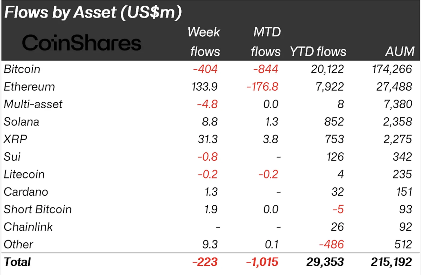 Los fundamentos de Ethereum se mantuvieron principalmente positivos, con productos de inversión financiera relacionados registrando su 15ª semana consecutiva de entradas, totalizando 134 millones de dólares. Otros activos que registraron entradas netas incluyeron XRP y Solana (SOL) con 31,3 millones de dólares y 8,8 millones de dólares, respectivamente.