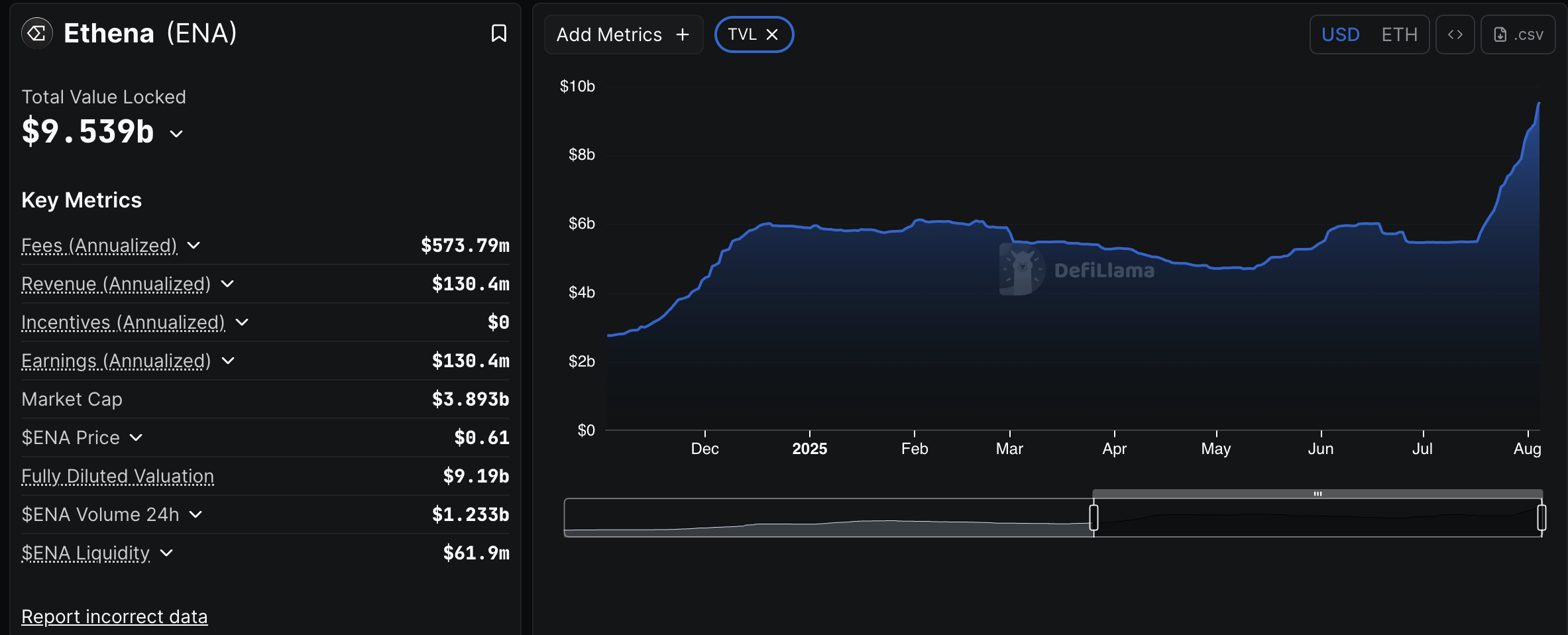 El ecosistema DeFi de Ethena ha estabilizado su crecimiento en los últimos meses, con su Valor Total Bloqueado (TVL) alcanzando un máximo de alrededor de 9.54 mil millones de dólares desde los 4.72 mil millones registrados el 4 de mayo.