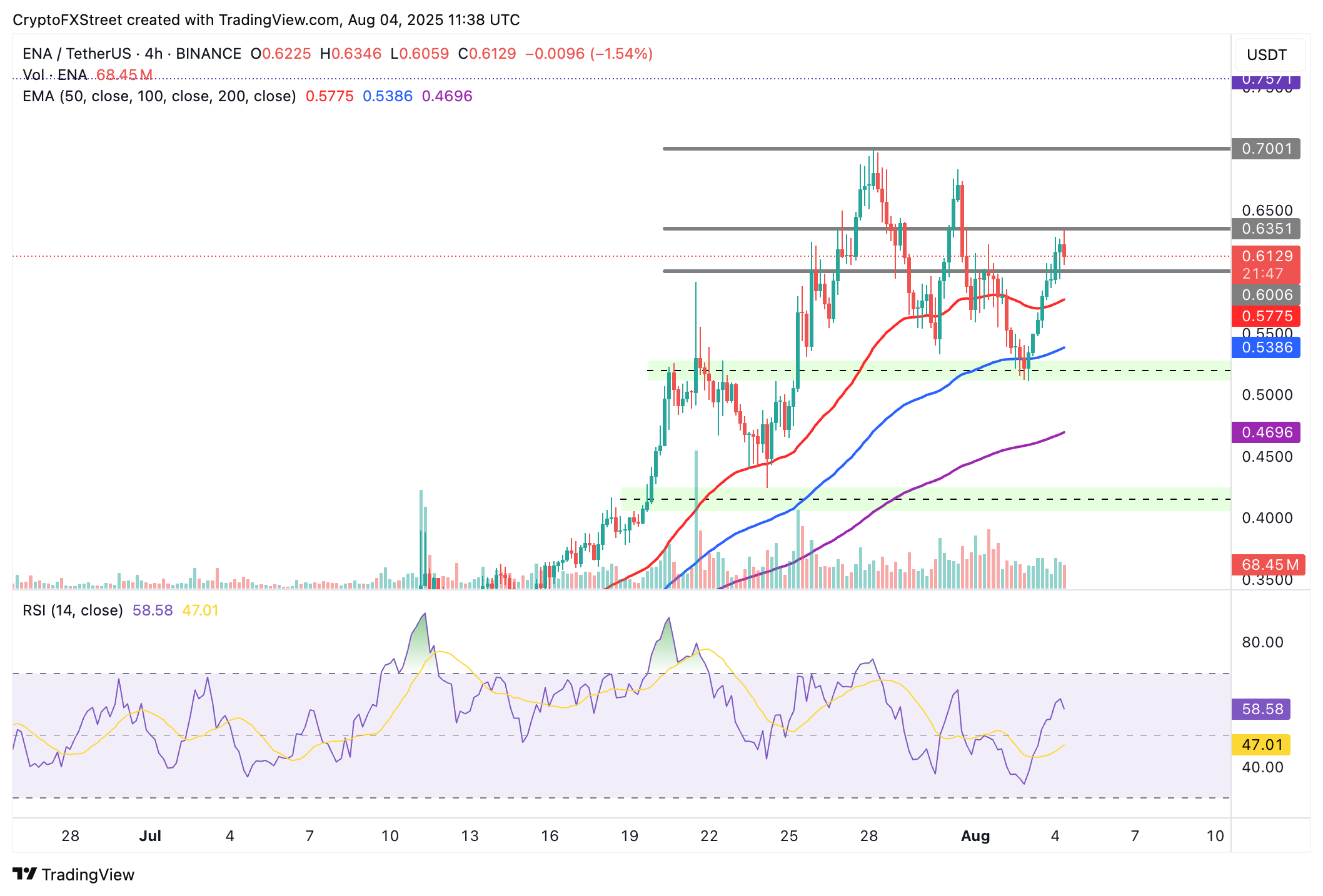 El precio de Ethena se mantiene por encima del soporte en 0.60$ en el momento de escribir, respaldado por un robusto ecosistema DeFi y un creciente interés minorista. El token también se sitúa por encima de medias móviles clave, incluyendo la Media Móvil Exponencial (EMA) de 50 días actualmente en 0.57$, la EMA de 100 períodos en 0.53$ y la EMA de 200 períodos en 0.46$. En caso de que la caída de la semana pasada se reanude, estos niveles servirían como soporte tentativo para evitar que ENA caiga hacia 0.40$.
