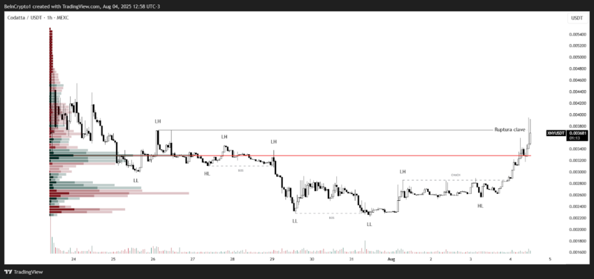 XNYUSDT ha dado una señal técnica contundente tras romper una resistencia clave en los 0.0033 dólares. El gráfico de 1 hora muestra un cambio de estructura con una secuencia de mínimos más altos (HL) y un claro CHoCH (Cambio de Caracter), seguido por una ruptura al alza con aumento de volumen.