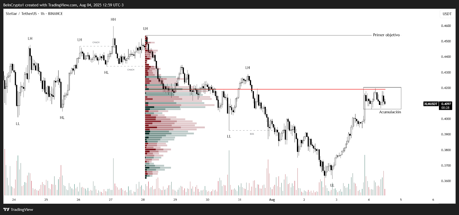 XLMUSDT presenta una estructura mixta. Luego de una fuerte caída y formación de mínimos más bajos, el precio rebotó con fuerza rompiendo niveles clave, formando una zona de acumulación entre 0.4100 dólares y 0.4200 dólares.