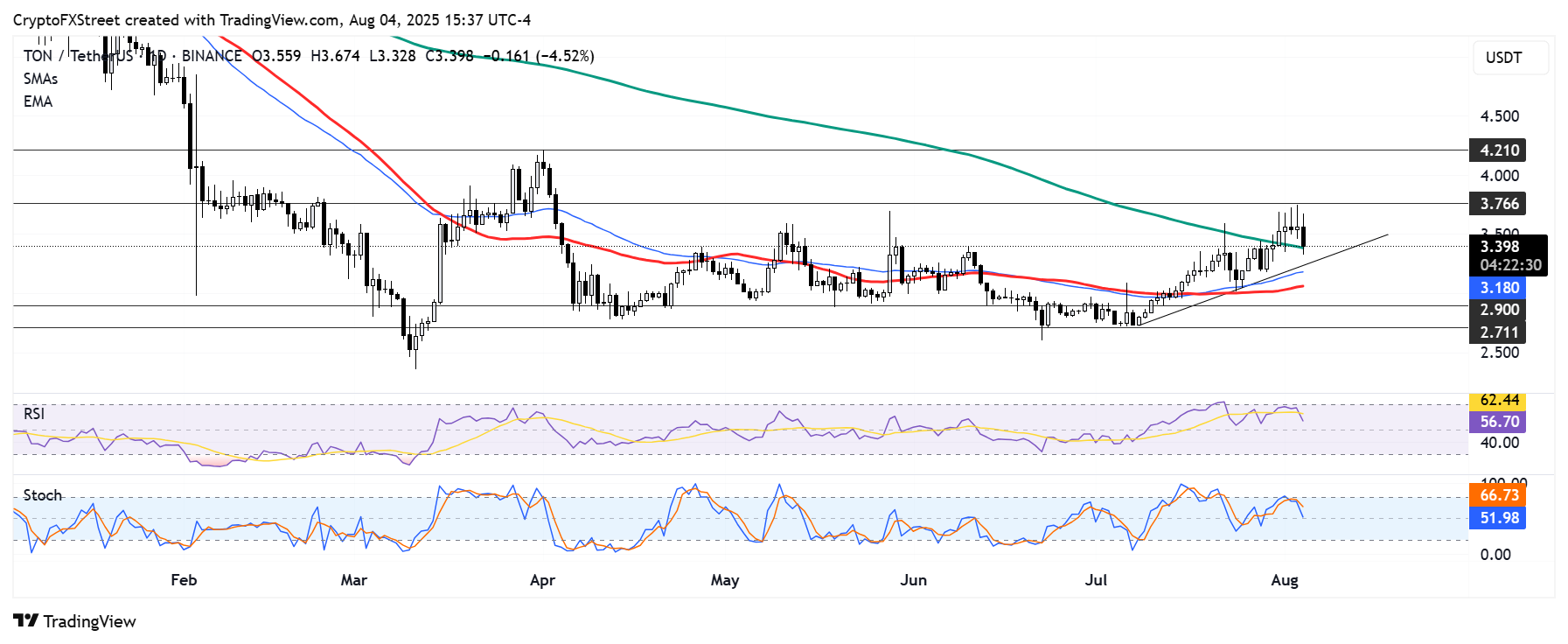 Después de cruzar por encima de la media móvil simple (SMA) de 200 días la semana pasada, TON vio un rechazo en la resistencia cerca de 3.76 $ el domingo. Tras su posterior caída, la altcoin está probando la SMA de 200 días. La línea de tendencia del límite inferior de un triángulo rectángulo ascendente podría proporcionar soporte a la baja si falla el soporte de la SMA de 200 días. Más abajo, TON tiene niveles de soporte clave cerca de la media móvil exponencial (EMA) de 50 días y SMA, 2.90$ y 2.71$, respectivamente.