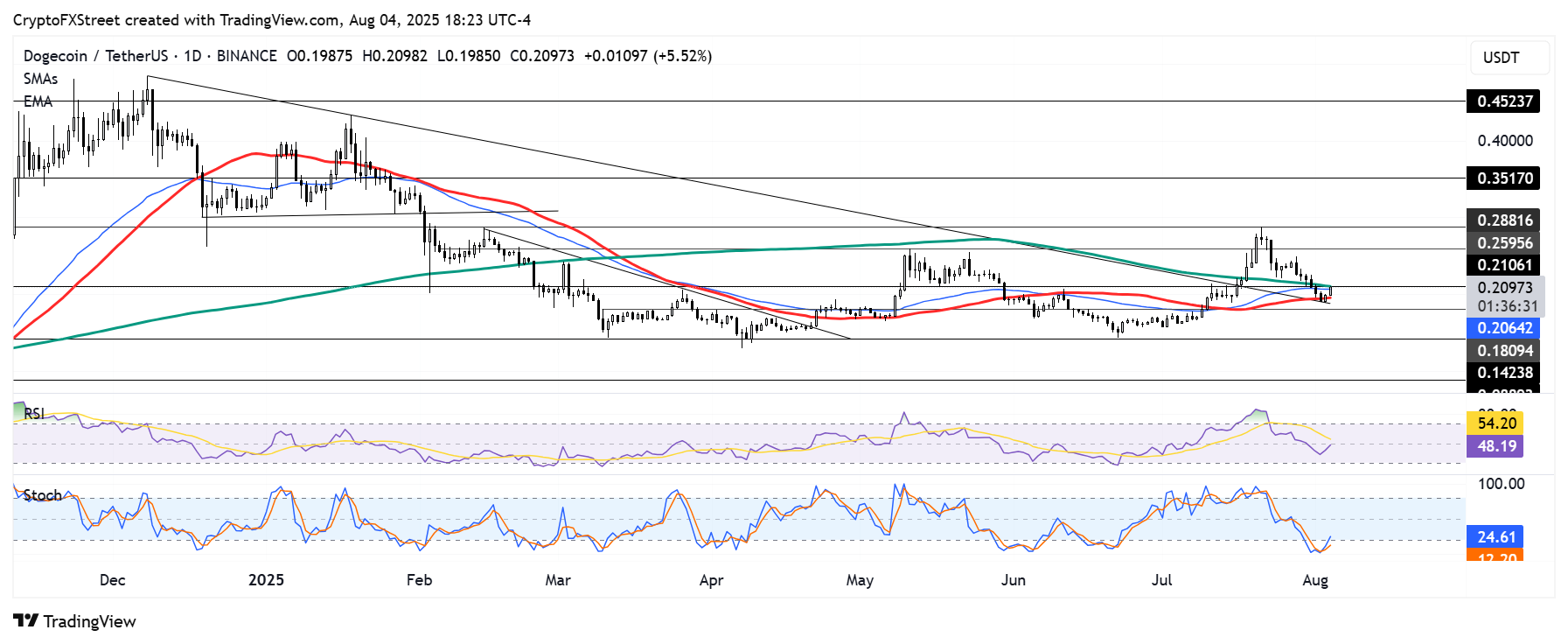 DOGE prueba 0.21$ mientras el Stoch se recupera de condiciones de sobreventa