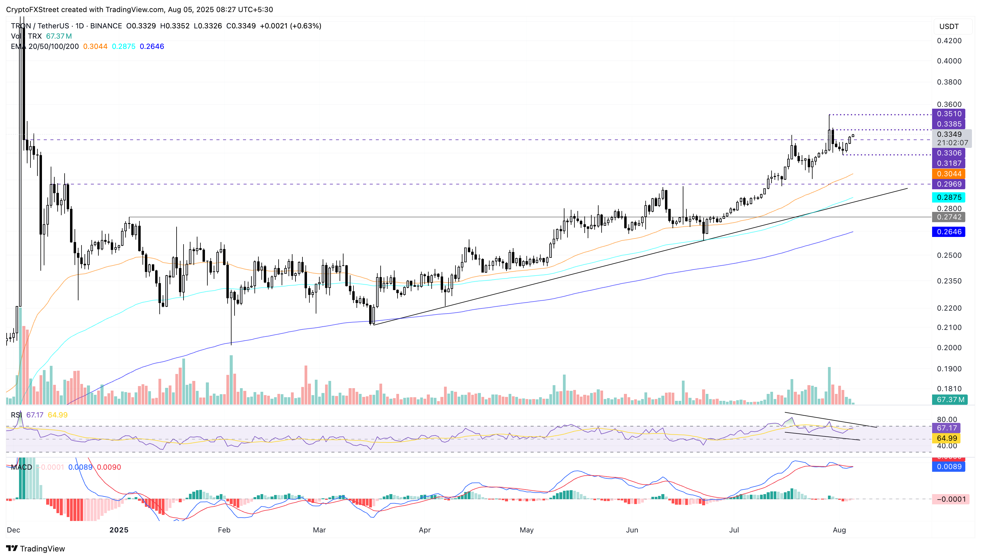 Mirando hacia arriba, si TRX supera el nivel de 0.3385$, podría volver a probar el máximo de la semana pasada en 0.3510$.