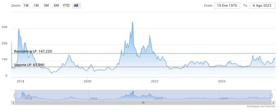 La resistencia a largo plazo se encuentra en los 147.22 dólares. Mientras, los indicadores de Ei se muestran mixtos.