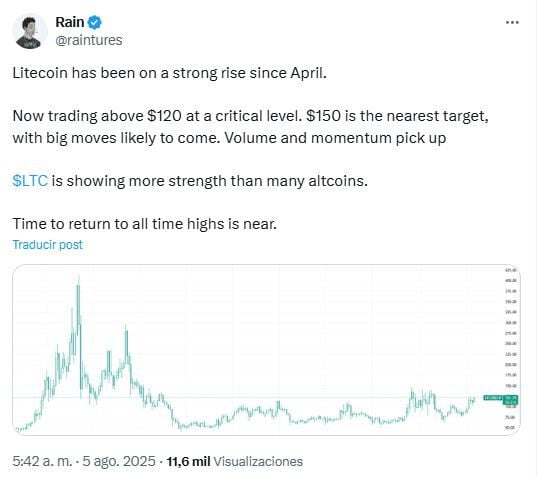 Según el cripto analista Rain en X, el próximo objetivo para Litecoin se encuentra en los 150 dólares. Esperando que se produzcan grandes movimientos para la criptomoneda.