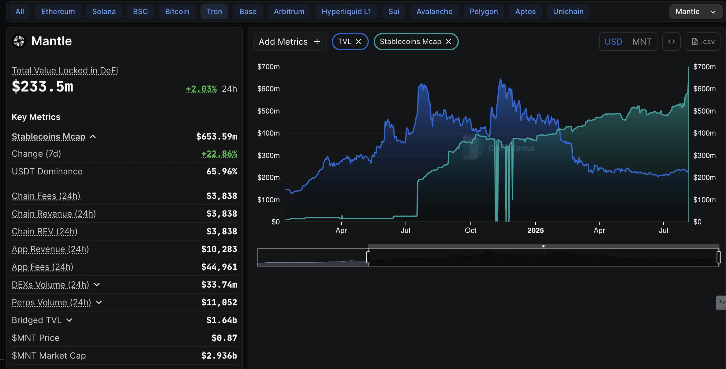 El capital ha estado fluyendo hacia el ecosistema de Mantle, como lo demuestra el crecimiento en la capitalización de mercado de stablecoins de la red. Los datos de DefiLlama muestran que en las últimas 24 horas, la participación de mercado de stablecoins en Mantle aumentó un 23% a aproximadamente 654 millones de dólares.