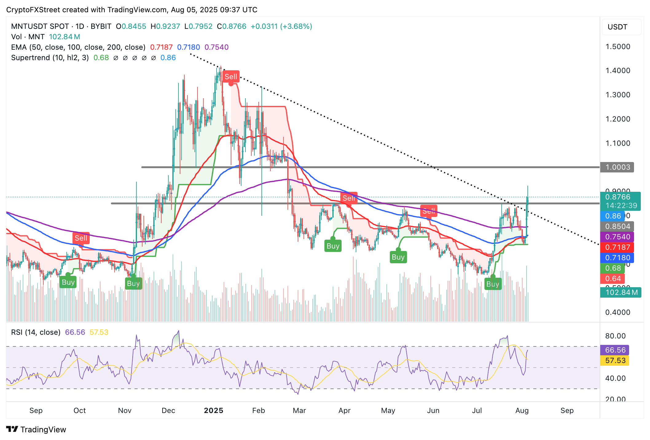 El precio de Mantle (MNT) extiende las ganancias el martes, cotizando alrededor de 0.87$ en el momento de escribir, tras el aumento de casi el 20% del lunes. El token, conocido por conectar las Finanzas Tradicionales (TradFi) y las Finanzas Descentralizadas (DeFi) al garantizar seguridad y escalabilidad, está experimentando un aflujo de capital respaldado por el interés institucional y minorista.