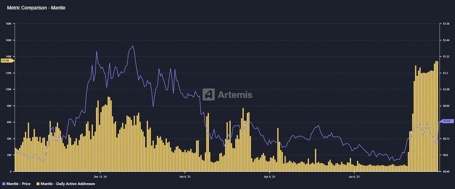 Las Direcciones Activas en la Red Mantle también han experimentado un gran impulso, creciendo más del 1.600%, de 7.000 a alrededor de 120.000 en menos de un mes, según Artemis Analytics. Este aumento se alinea con la reacción positiva en el precio de MNT, que ha subido aproximadamente un 28% en agosto.
