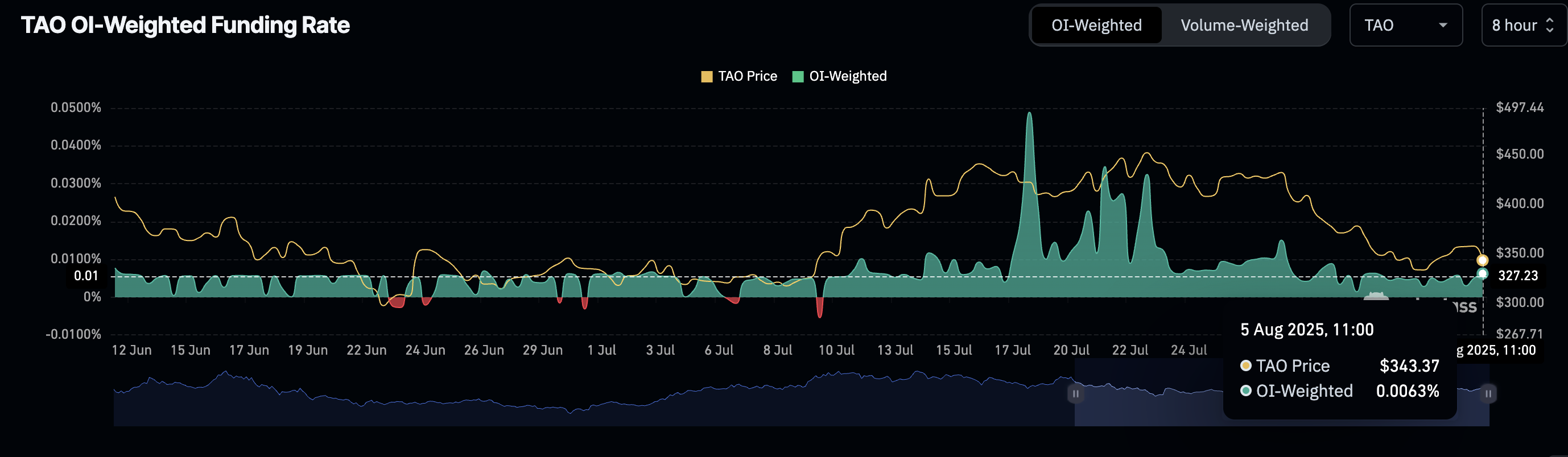 Las áreas clave de interés para los operadores son niveles de soporte tentativos en 328$ y 300$. La tendencia a la baja en TAO podría persistir en medio de una caída significativa en la tasa de financiación ponderada de futuros desde un pico de julio de 0.0489% hasta 0.0063% en el momento de escribir este artículo.