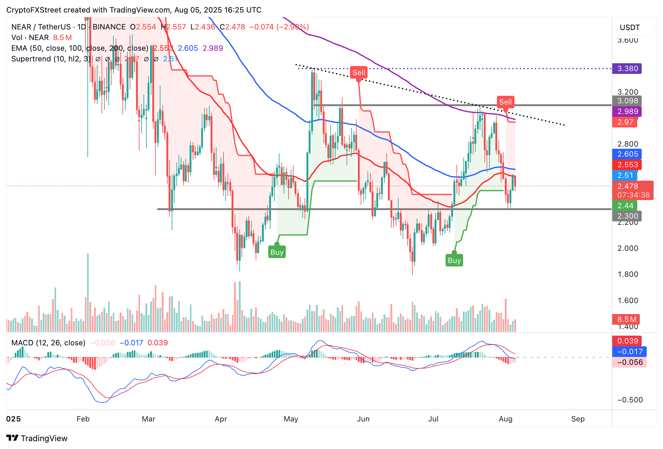 El precio de Near Protocol ha perdido soporte en 2.55$, destacado por la EMA de 50 días. La caída podría extenderse en las próximas sesiones debido a la presencia de dos señales de venta de los indicadores SuperTrend y MACD.