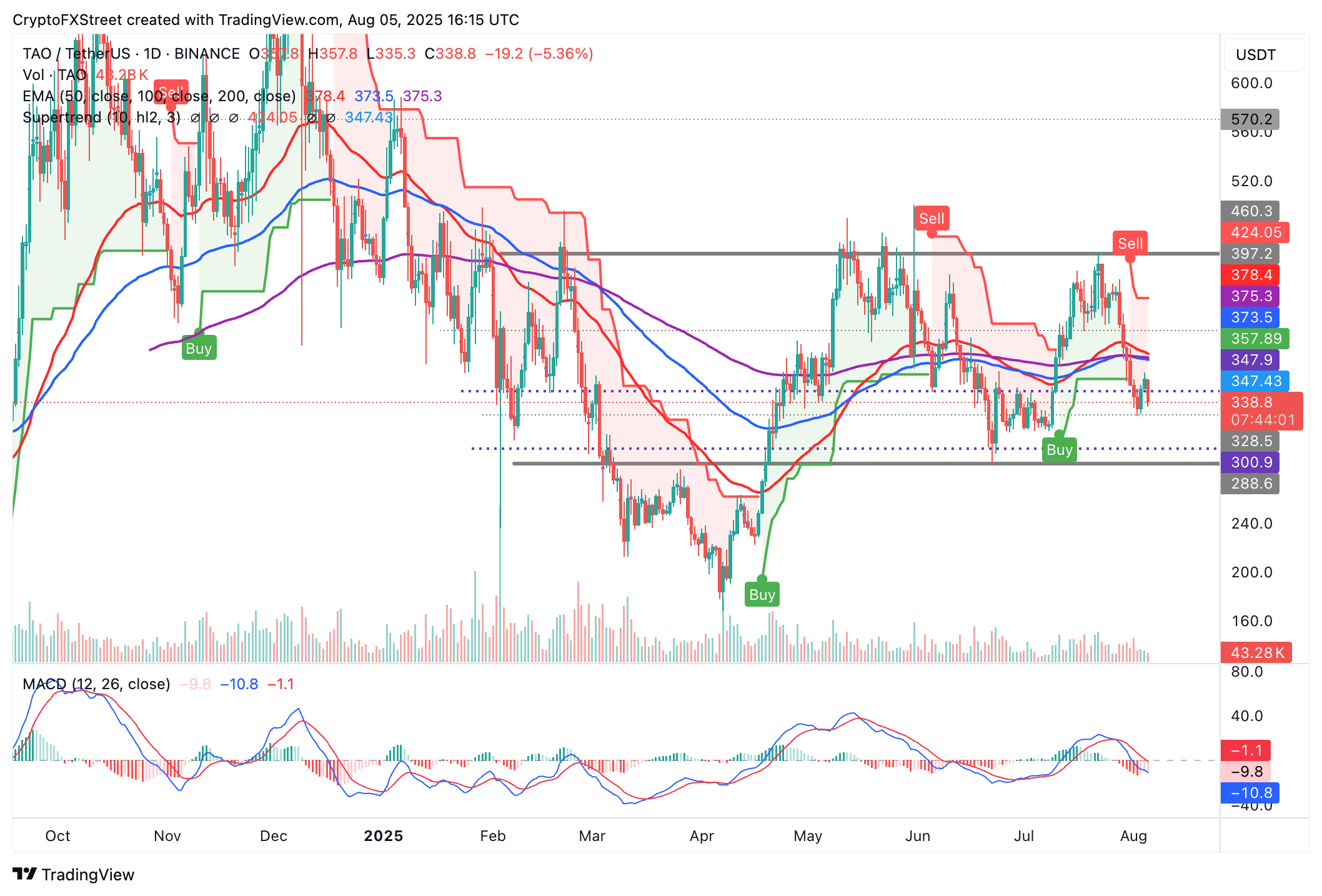 Las señales de venta de los indicadores de Convergencia/Divergencia de Medias Móviles (MACD) y SuperTrend refuerzan la perspectiva bajista. Los inversores pueden continuar reduciendo riesgos con la línea MACD azul manteniéndose por debajo de la línea de señal roja y la línea SuperTrend por encima del precio de TAO.