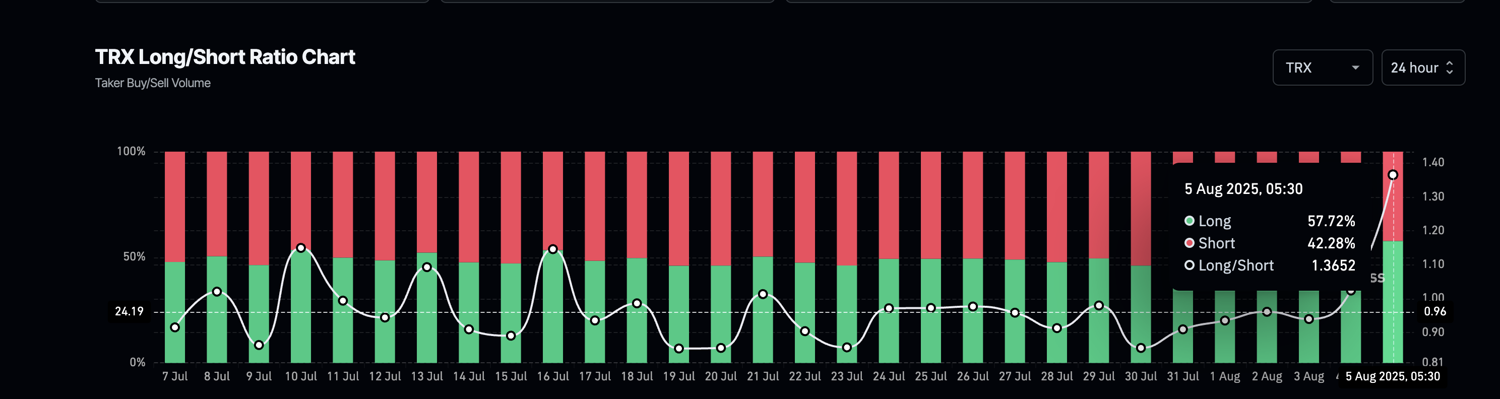 Aún así, el Long/Short ratio de TRON sugiere que los traders minoristas están posicionándose para el alza. Al 5 de agosto, el Long/Short ratio ha subido a 1.36, con casi el 58% de todas las operaciones abiertas favoreciendo los largos.
