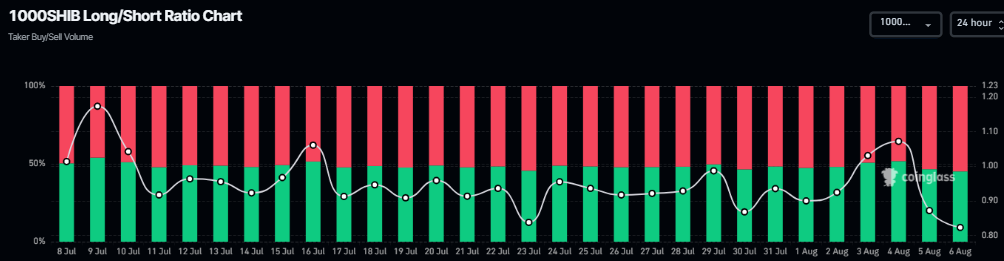 El ratio largo-corto de CoinGlass para DOGE y SHIB es de 0.86 y 0.82, respectivamente, el miércoles, el nivel más bajo en más de un mes. El ratio por debajo de uno sugiere un sentimiento bajista en el mercado, y los operadores están apostando a que el precio del activo caerá.
