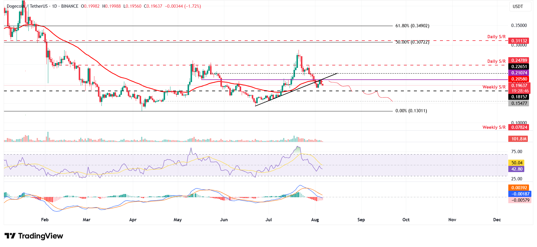 El precio de Dogecoin rompió por debajo de la línea de tendencia ascendente (dibujada al conectar múltiples mínimos desde el 22 de junio) el viernes, cerrando por debajo de su media móvil exponencial de 50 días en 0.20$. Sin embargo, DOGE se recuperó ligeramente de domingo a lunes pero no logró cerrar por encima de la línea de tendencia previamente rota y continuó su corrección el martes. En el momento de escribir el miércoles, extiende su declive operando por debajo de 0.19$.