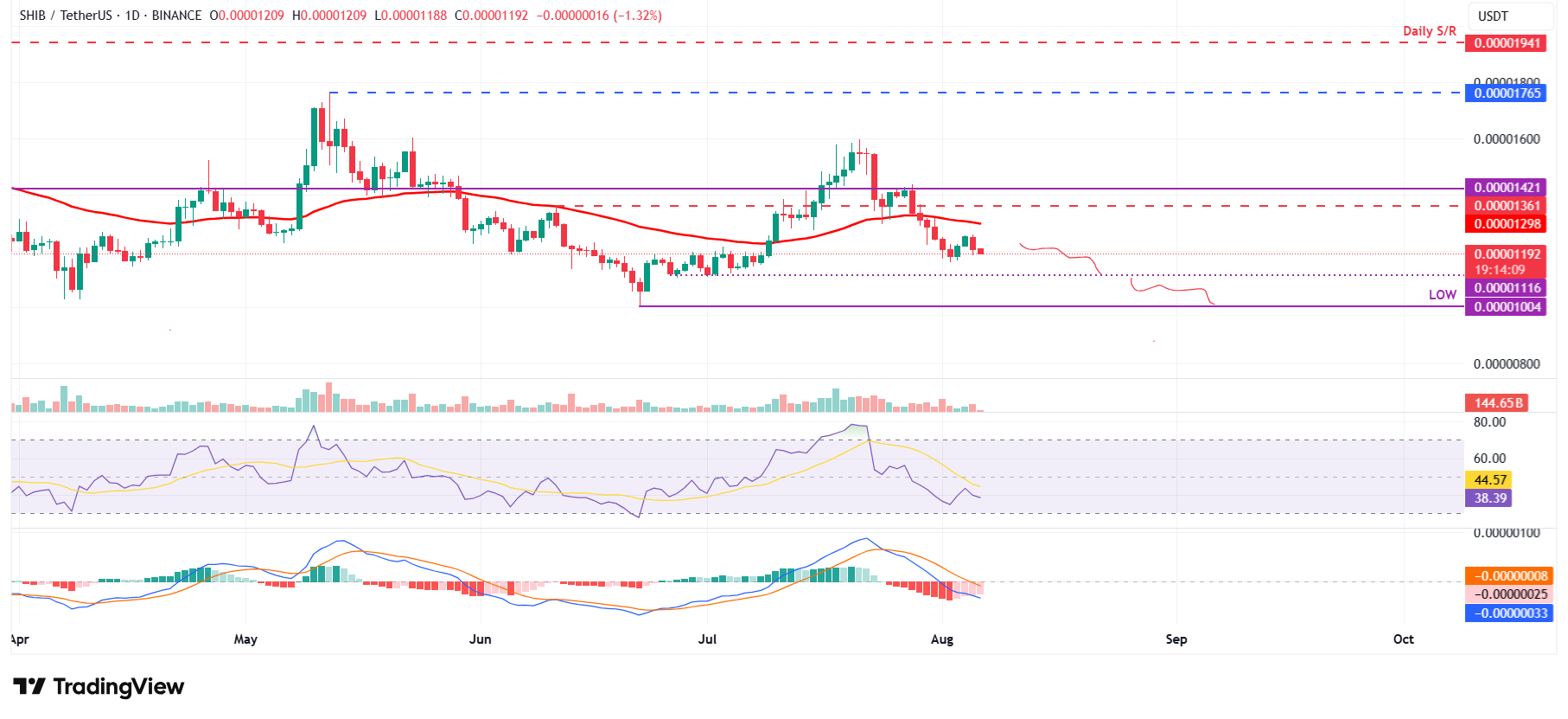 El precio de Shiba Inu cerró por debajo de su EMA de 50 días el 29 de julio y cayó un 10% en los siguientes cuatro días. Sin embargo, SHIB se recuperó ligeramente de domingo a lunes pero no logró mantener su recuperación y continuó su declive el martes. En el momento de escribir el miércoles, continúa su corrección, operando alrededor de 0.0000119$.