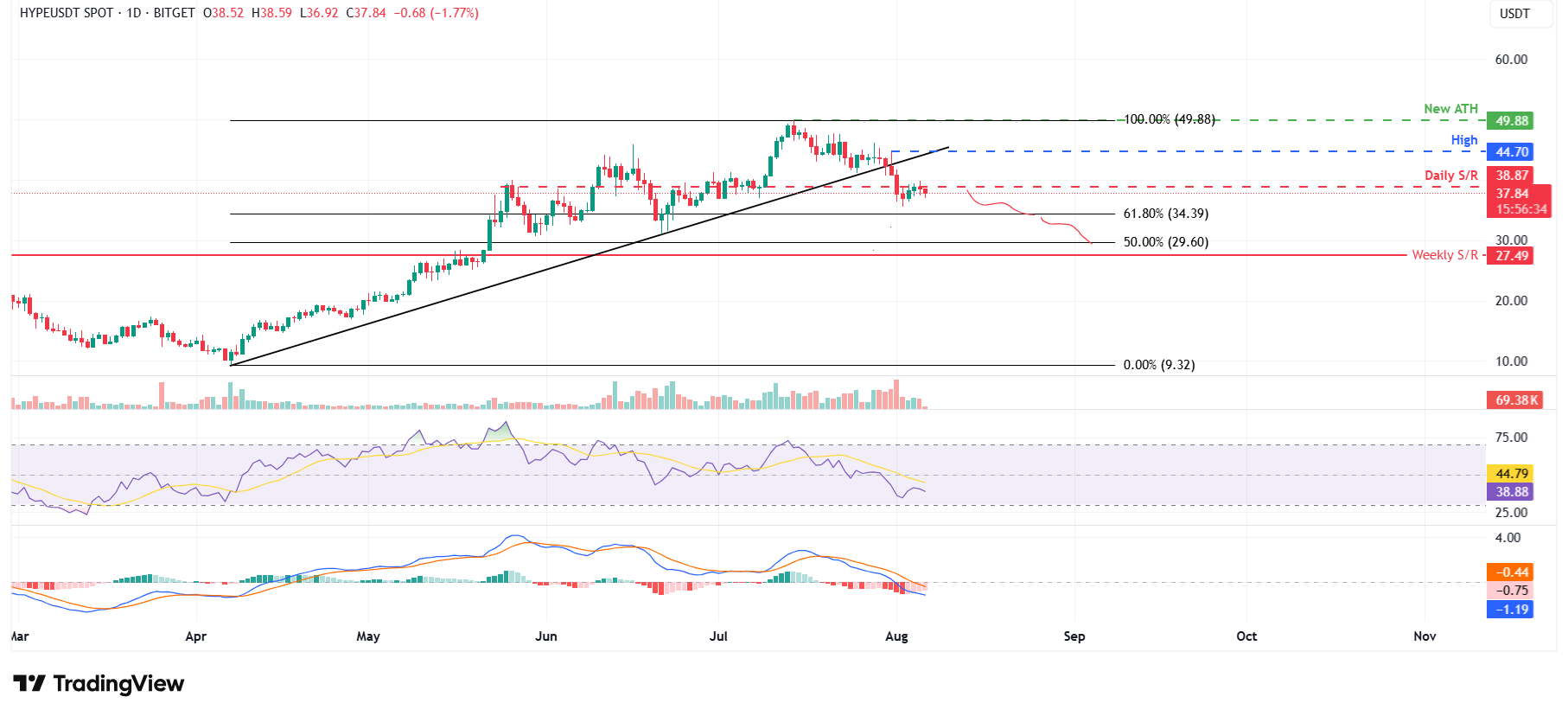 Si HYPE cierra por encima de la resistencia diaria en 38.87$, podría extender la recuperación hacia el máximo del 31 de julio de 44.70$.