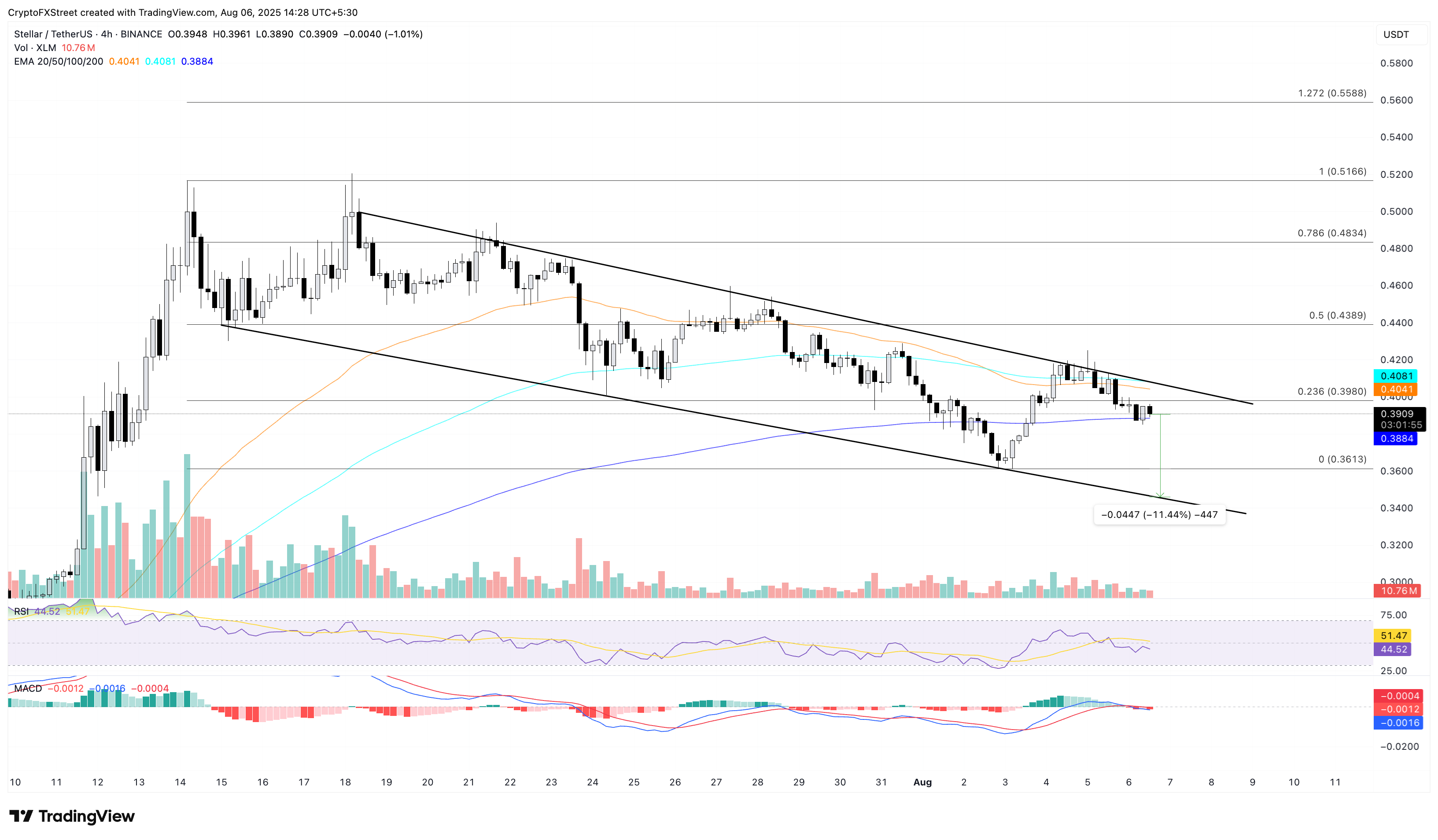 Stellar prueba la Media Móvil Exponencial (EMA) de 200 períodos en 0.3884$ en el gráfico de 4 horas, extendiendo la caída del 4.30% del día anterior. La tendencia a la baja se sitúa por debajo del nivel de Fibonacci del 23.6% en 0.3980$, dibujado desde el pico de 0.5166$ del 14 de julio hasta el mínimo de 0.3613$ del domingo.