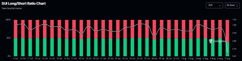 Los datos de derivados de Sui muestran una perspectiva bajista. La relación larga-corta de CoinGlass lee 0.63 el jueves, marcando el nivel más bajo en más de un mes. Una relación por debajo de uno sugiere un sentimiento bajista en el mercado, ya que los operadores están apostando a que el precio de Sui caerá.