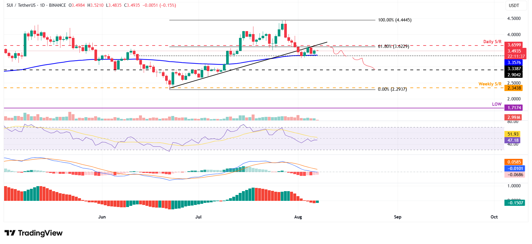 El precio de Sui cerró por debajo de su línea de tendencia ascendente (dibujada uniendo múltiples mínimos desde el 22 de junio) la semana pasada el viernes y cayó casi un 4% al día siguiente. Sin embargo, SUI se recuperó después de encontrar soporte alrededor de la media móvil exponencial (EMA) de 200 días en 3.35$ el domingo, volviendo a probar su línea de tendencia rota al día siguiente. Esta línea de tendencia rota coincide aproximadamente con el nivel de resistencia diario en 3.65$ y el nivel de retroceso de Fibonacci del 61.8% en 3.62$, convirtiéndolo en una zona de resistencia clave. El martes, no logró cerrar por encima de esta zona de resistencia, cayó ligeramente, pero encontró soporte al día siguiente alrededor de su EMA de 200 días. En el momento de escribir el jueves, se mantiene alrededor de 3.50$.