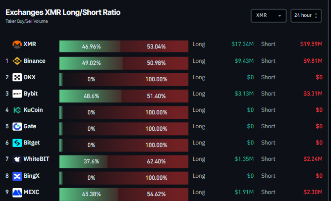 Los datos de CoinGlass indican que la relación larga-corta de Monero en todos los intercambios muestra que el 53.04% de los operadores están apostando a que el precio del activo caerá.