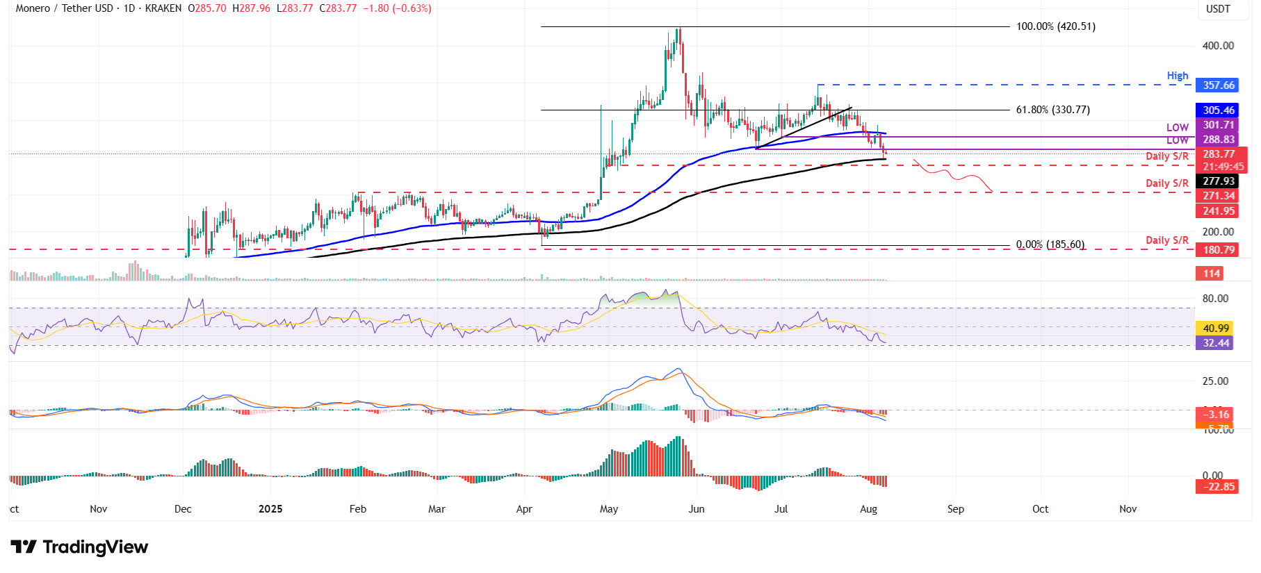 El precio de Monero enfrentó un rechazo de su línea de tendencia ascendente previamente rota (dibujada conectando múltiples mínimos desde mediados de junio) el 25 de julio y cayó más del 12% en los siguientes 13 días para alcanzar el nivel más bajo desde el 7 de mayo. En el momento de escribir este artículo el jueves, continúa negociándose por debajo de 284 $.
