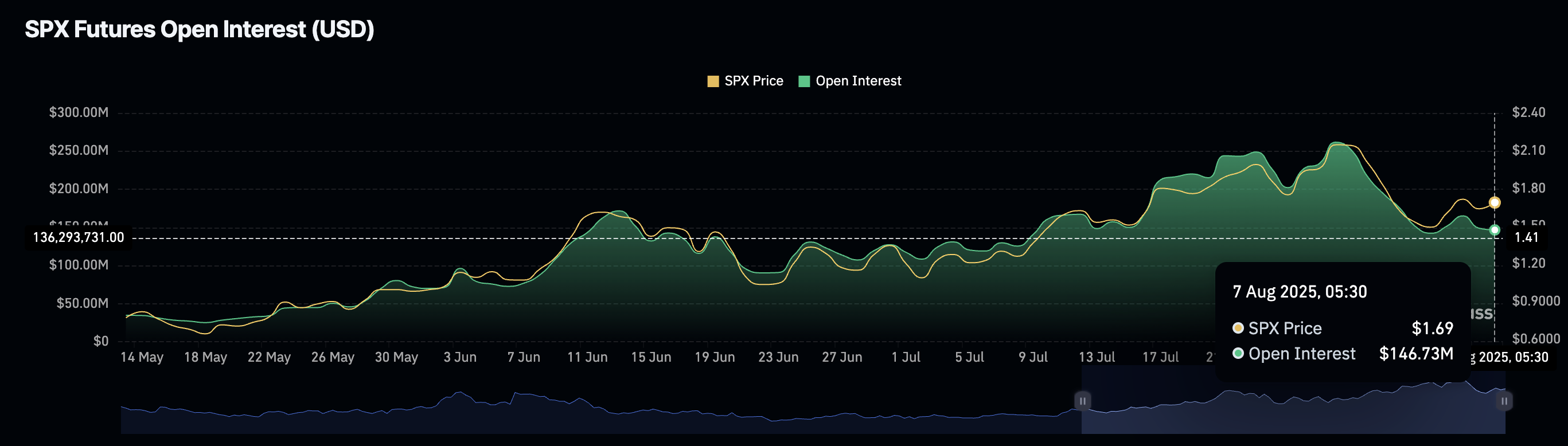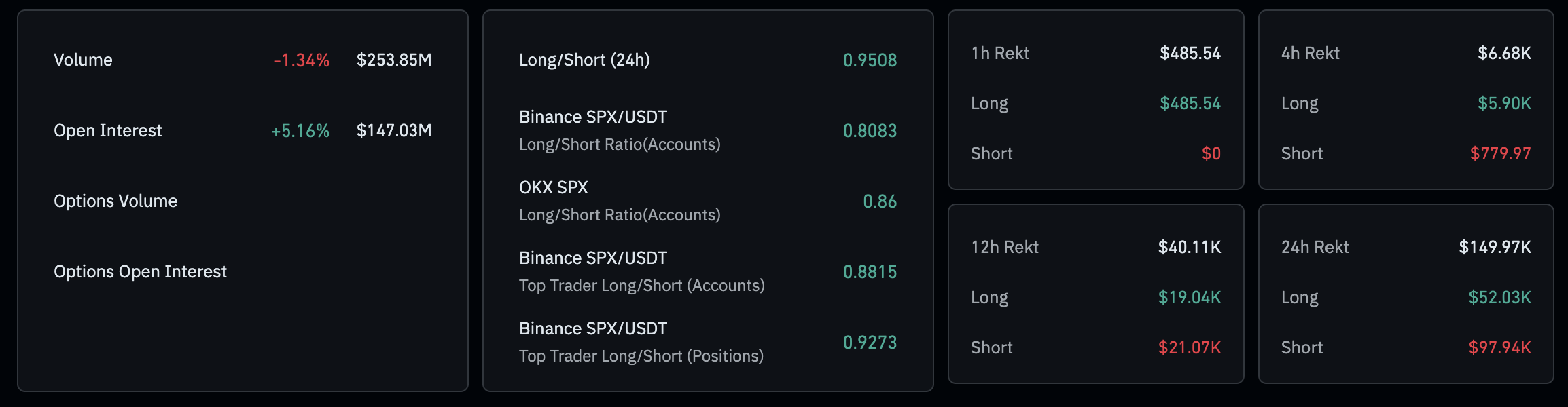 Los datos de Coinglass muestran que el OI de SPX se sitúa en 146.73 millones de dólares en el momento de la publicación, manteniendo una tendencia estancada tras una caída la semana pasada, que se alineó con la caída del precio al contado. A medida que los operadores recuperan confianza, una desaceleración en la salida de capital de los contratos de futuros y opciones de SPX estabiliza el OI.