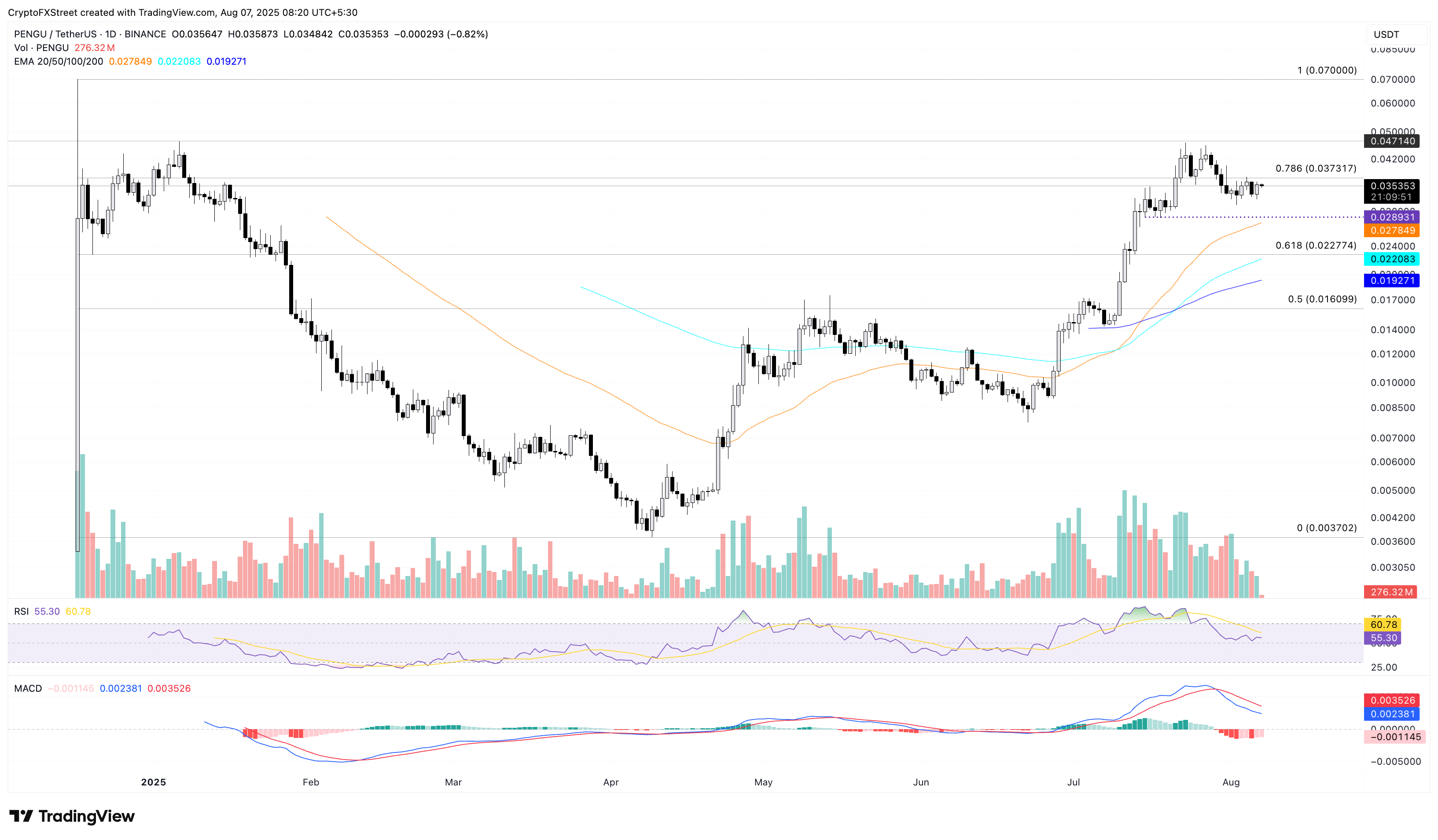 PENGU lucha por superar el nivel de Fibonacci del 78.6% en $0.03717, que se traza desde $0.07000 el 17 de diciembre hasta $0.00370 el 9 de abril. Un empuje decisivo por encima de este nivel podría alimentar un rally de reversión hacia el nivel de $0.04714 marcado por el máximo del 6 de enero.