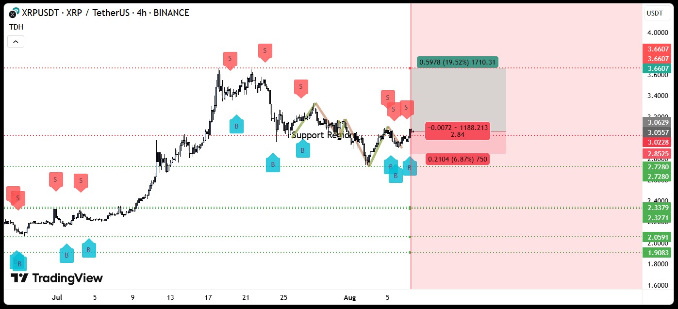 Un análisis técnico publicado en la comunidad de TradingView por la empresa SuperTrade, con el título «El gráfico de XRP grita ‘¡Alcista!», muestra un potencial escenario de impulso para XRP. El analista considera que, tras la fuerte corrección desde los 3,66 dólares a los actuales USD 3,03, el precio de XRP habría formado una estructura de reversión, con un soporte sólido identificado en la zona de USD 2,72 a 2,73 dólares.