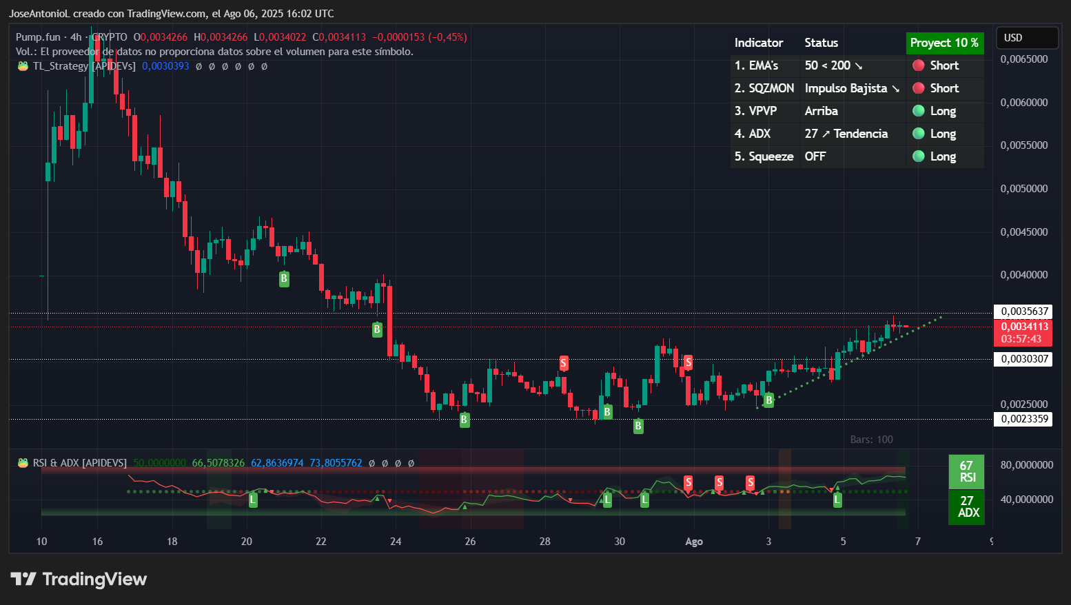 - Resistencia inmediata: $0,003567 (nivel de prueba actual y zona de rechazo previa)