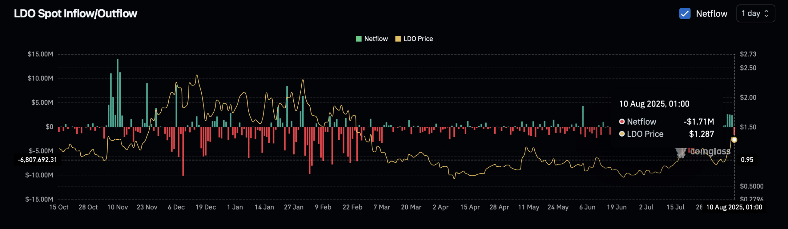 LDO registró $ 1.71 millones en salidas netas de los intercambios el 10 de agosto, lo que significa que los tokens se trasladaron a billeteras privadas. Sin mencionar que esta es una señal de acumulación clara.