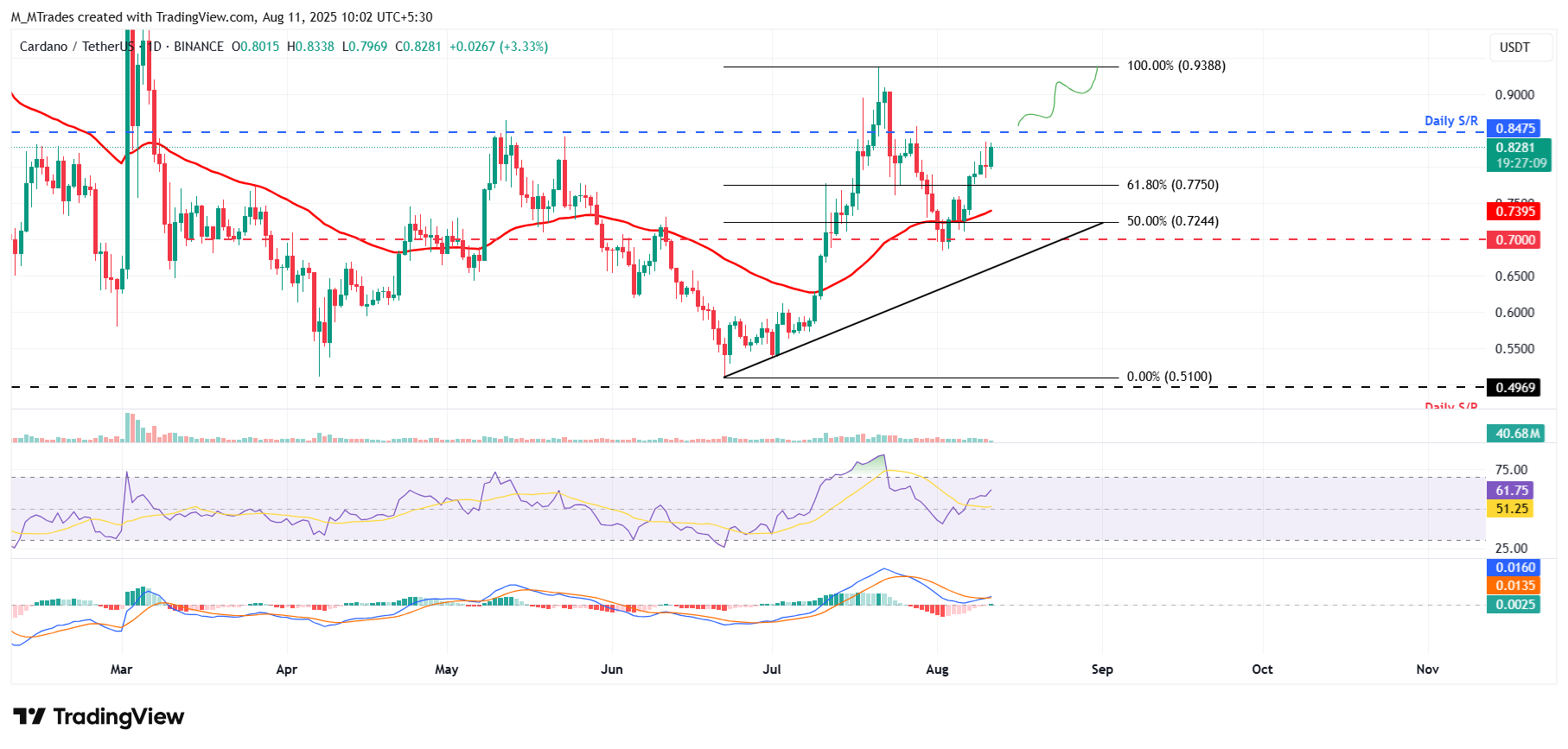 El precio de Cardano encontró soporte alrededor de su nivel clave en 0.70$ el 3 de agosto y repuntó casi un 15% hasta el domingo. En el momento de escribir el lunes, continúa extendiendo sus ganancias en un 3% cotizando por encima de 0.82$.