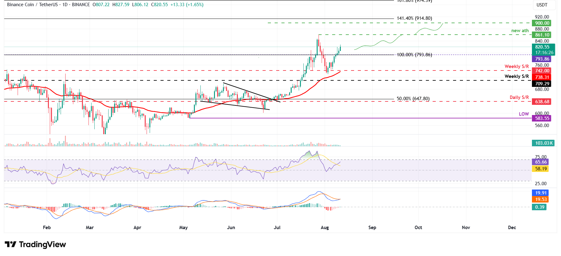 El precio de BNB encontró soporte alrededor de su nivel semanal de 742$ el martes y subió casi un 7% en los siguientes cinco días.