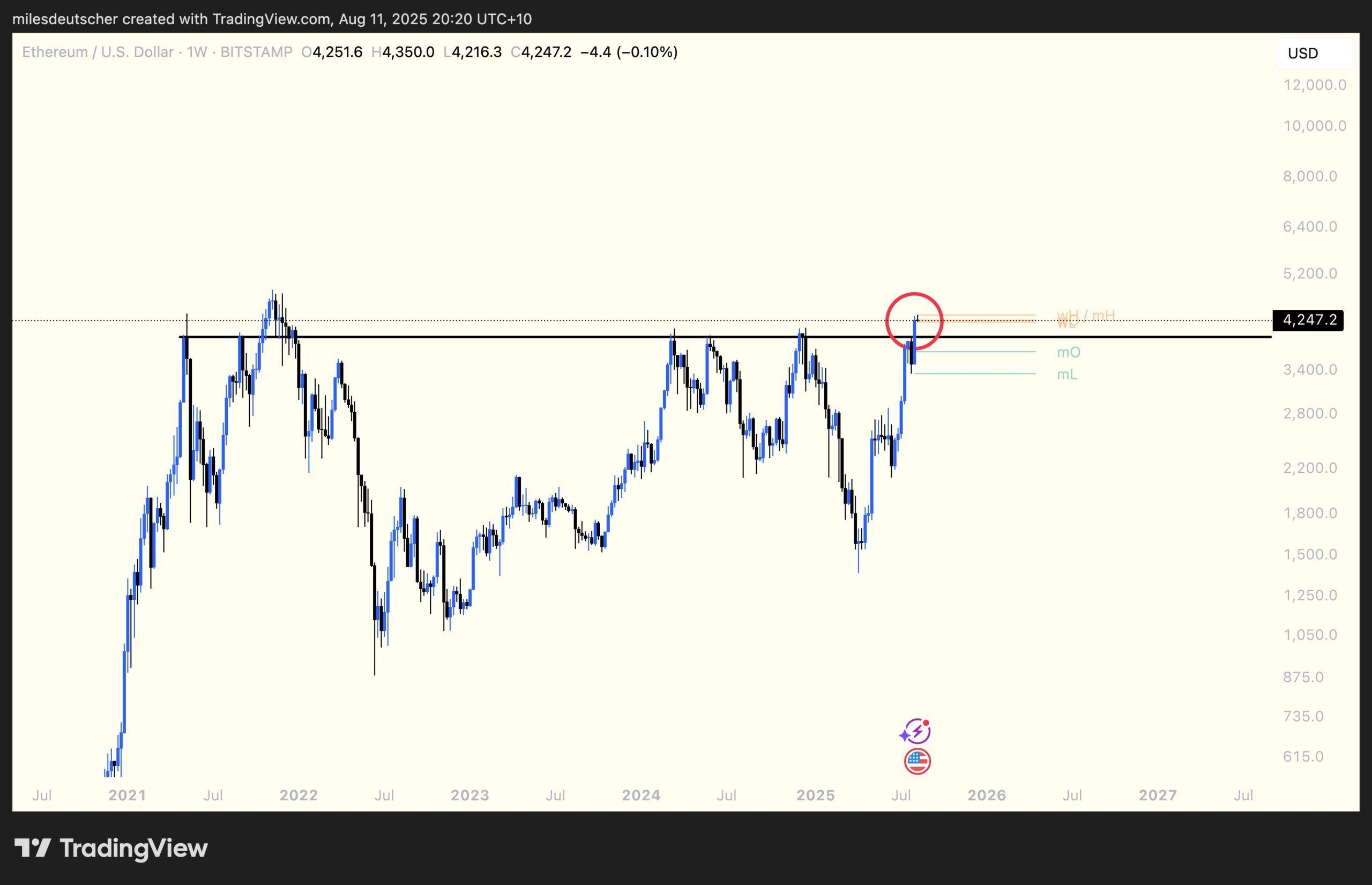 Según Miles, otro factor es que ETH ha recuperado el nivel de 4,000 dólares, un máximo de varios años, lo que proporciona un fuerte momentum hacia su máximo histórico de 2021.