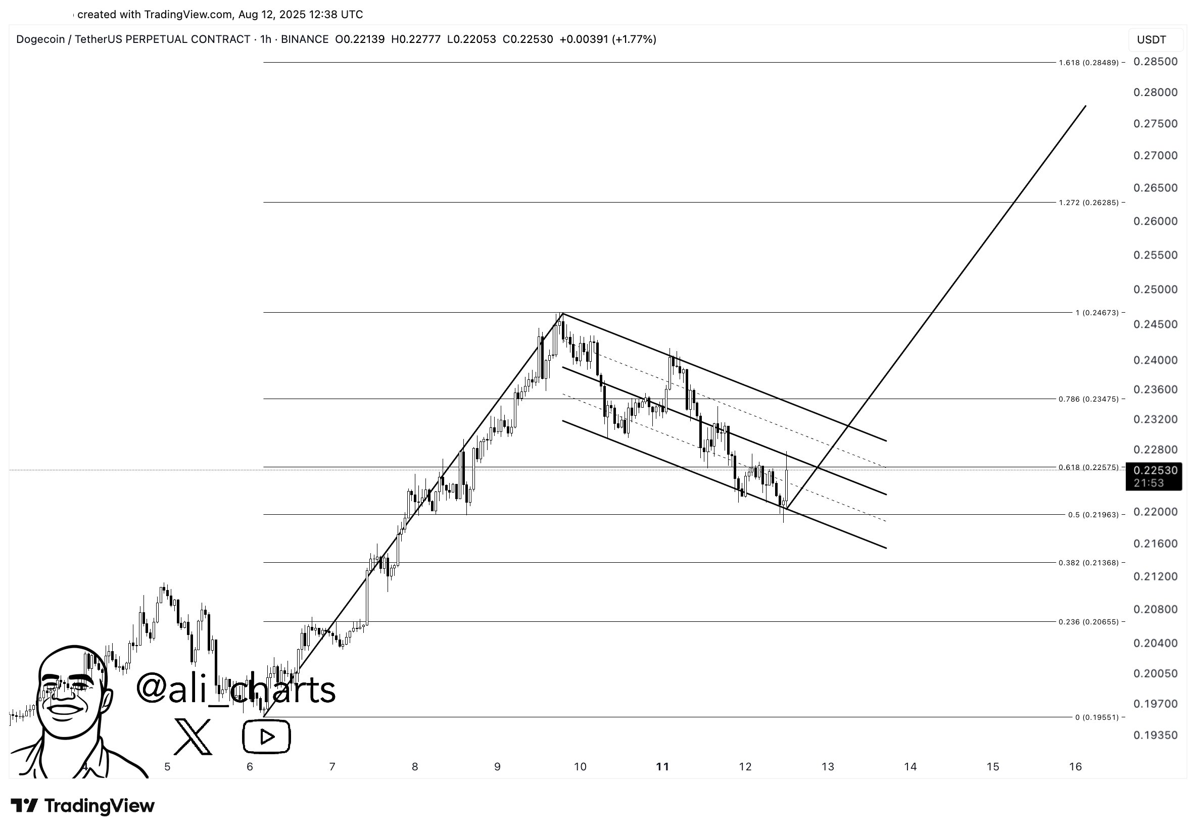 El analista, al compartir el gráfico anterior para Dogecoin, señaló la formación de un patrón de bandera alcista. Esta formación en el gráfico horario indica que DOGE podría probar $0,27. Si BTC puede mantener el soporte de $120,000 y Ethereum continúa estableciendo nuevos récords, el pico optimista para DOGE podría estar alrededor de $0,75.