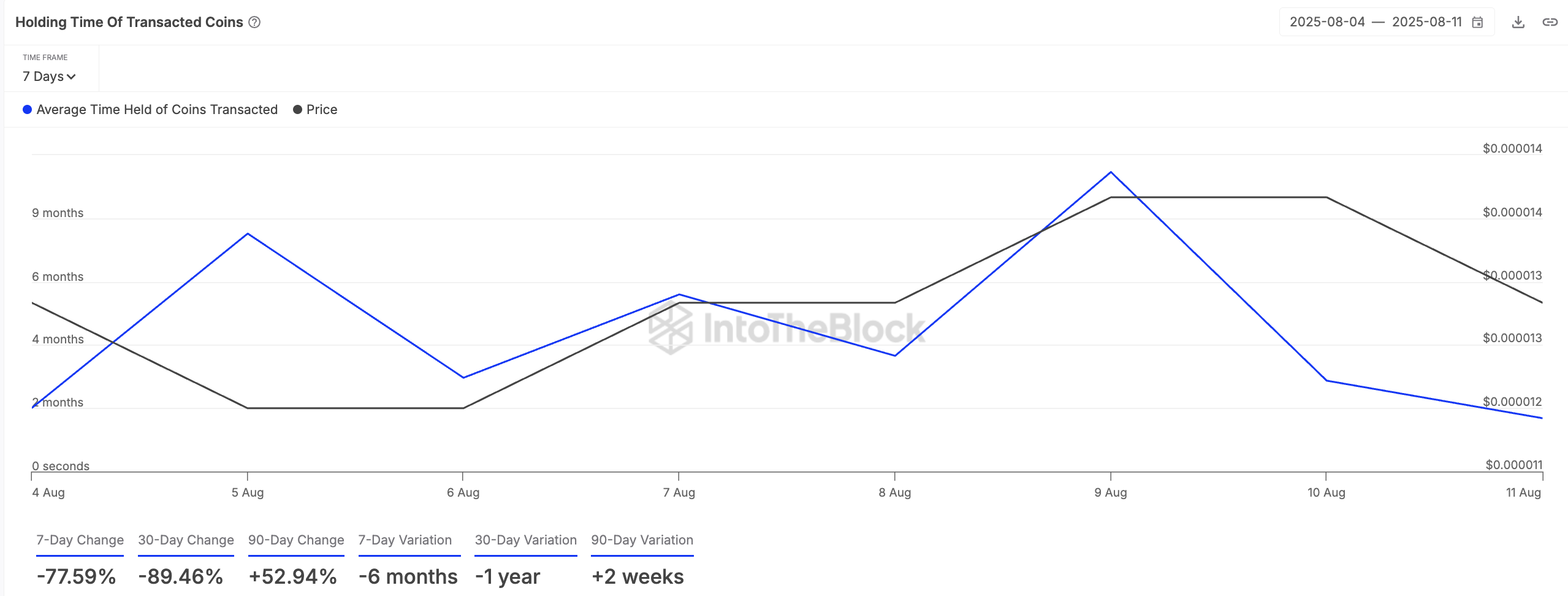 Los inversores de SHIB han reducido su tiempo de holding, una señal clara de que el sentimiento bajista alrededor del memecoin está creciendo. Los datos de IntoTheBlock muestran que el tiempo promedio de holding para los tokens SHIB transaccionados ha caído un 78% en los últimos siete días.