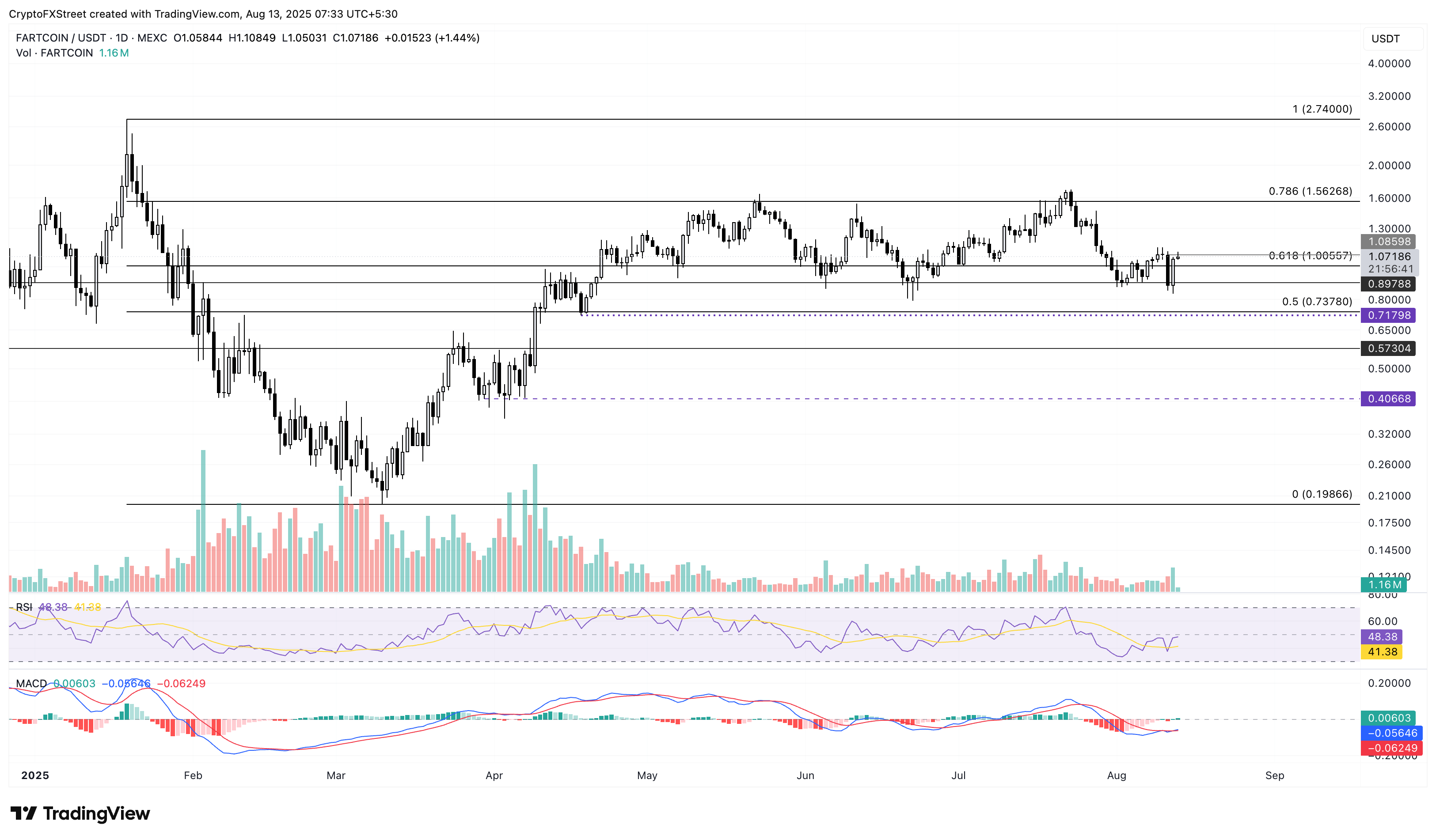 Para reforzar una tendencia alcista, FARTCOIN debería superar el nivel de 1.085$ para superar la vela envolvente bajista formada el lunes. Esto podría extender el repunte hasta el nivel de Fibonacci del 78.6% en 1.562$.