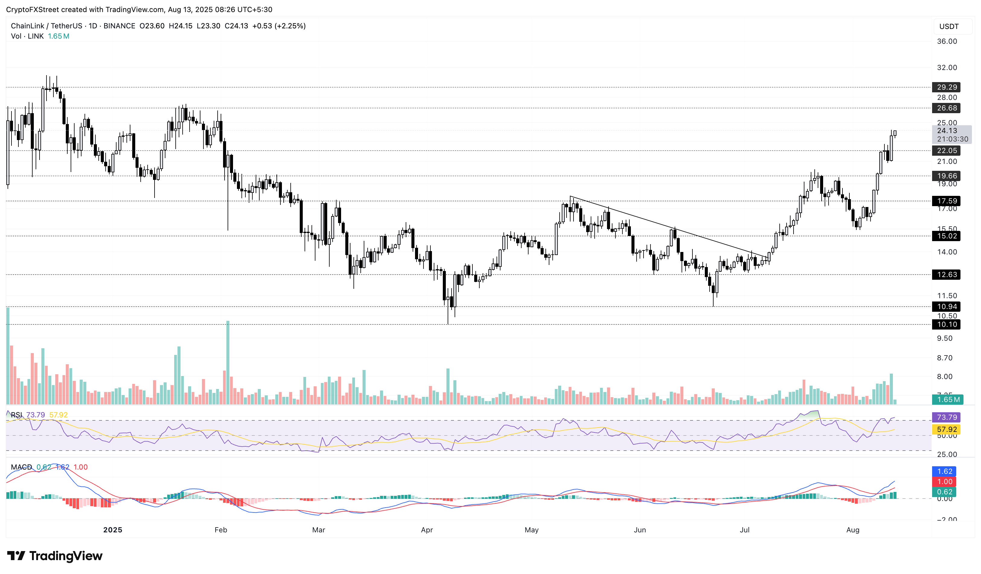 La tendencia alcista en LINK tiene como objetivo el nivel de 26.86$ probado por última vez el 22 de enero, para un aumento del 10% desde el precio de mercado actual.