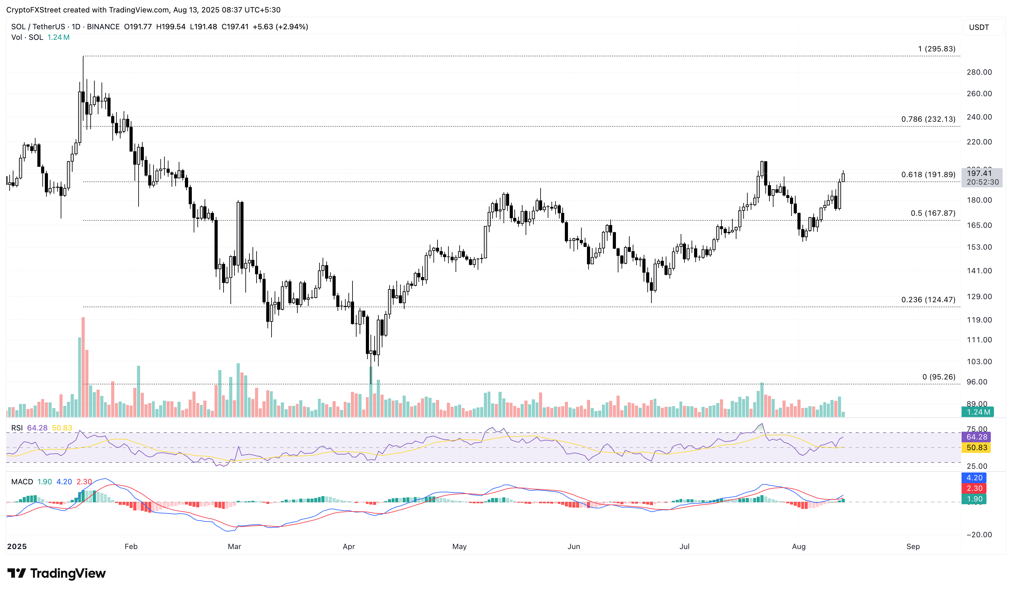 Un cierre decisivo por encima del nivel de Fibonacci del 61.8% podría extender la tendencia alcista en SOL hasta el nivel de Fibonacci del 78.6% en 232$.