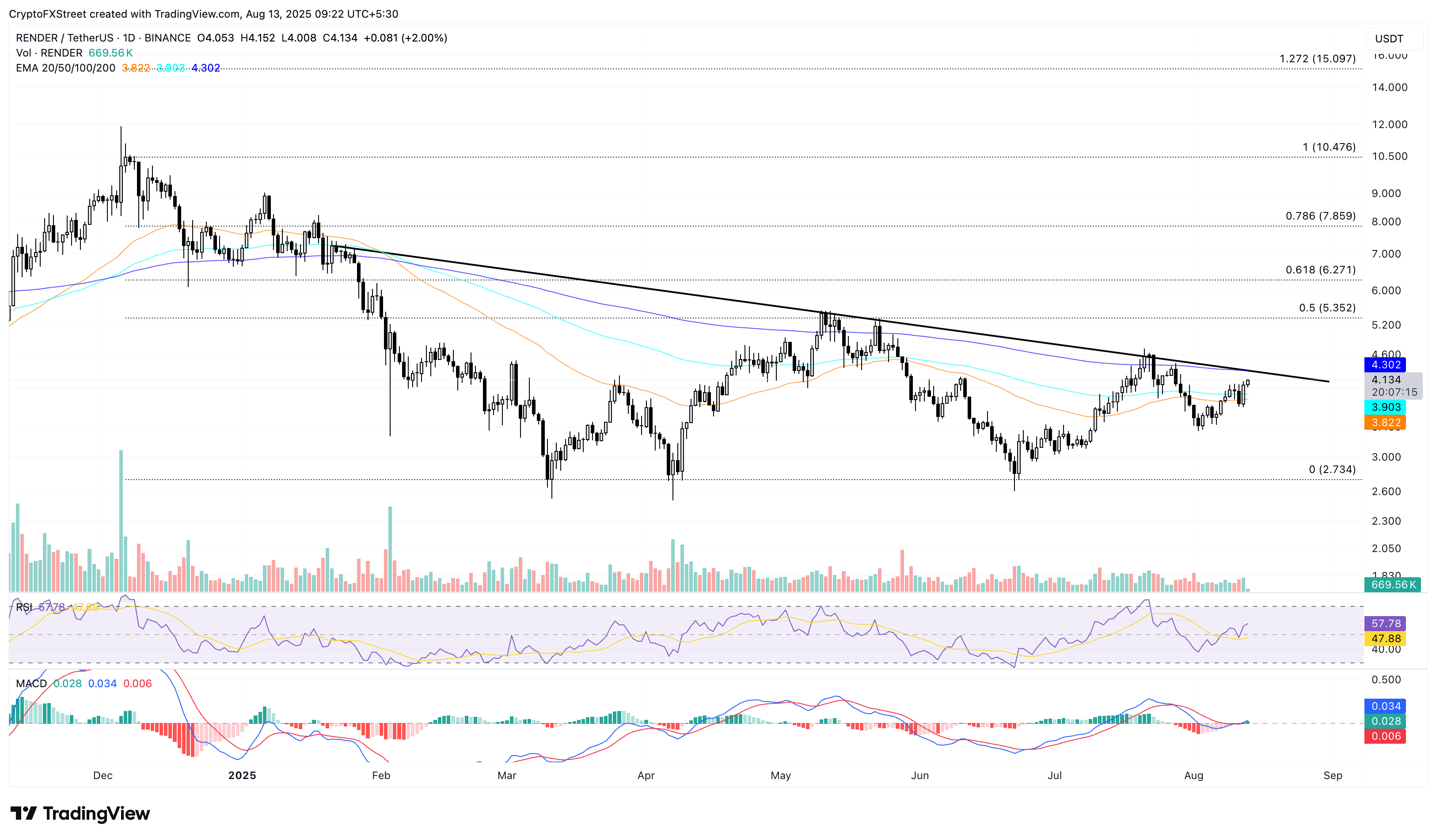 Render rebotó un 8% el martes y extendió la tendencia alcista en un 2% en el momento de la redacción el miércoles. La recuperación en RENDER apunta a la EMA de 200 días en 4.30 $, moviéndose de cerca con una línea de tendencia de resistencia formada al conectar los cierres del 21 de enero y del 10 de mayo.