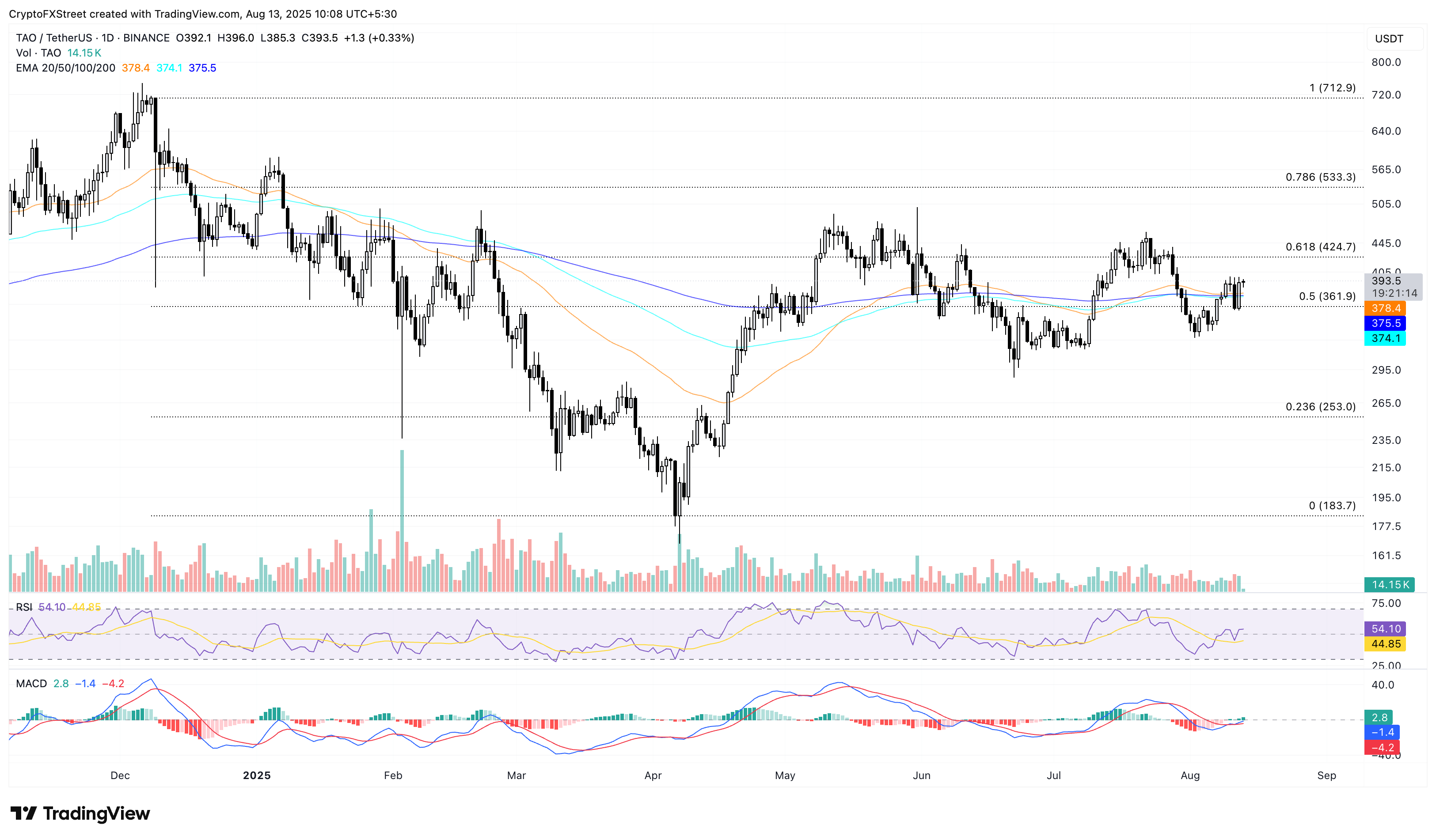El rebote en TAO lucha por recuperar el nivel de 400 $, mientras que los toros apuntan al nivel de Fibonacci del 61.8% en 424 $. Un cierre decisivo por encima del nivel psicológico podría extender la recuperación.