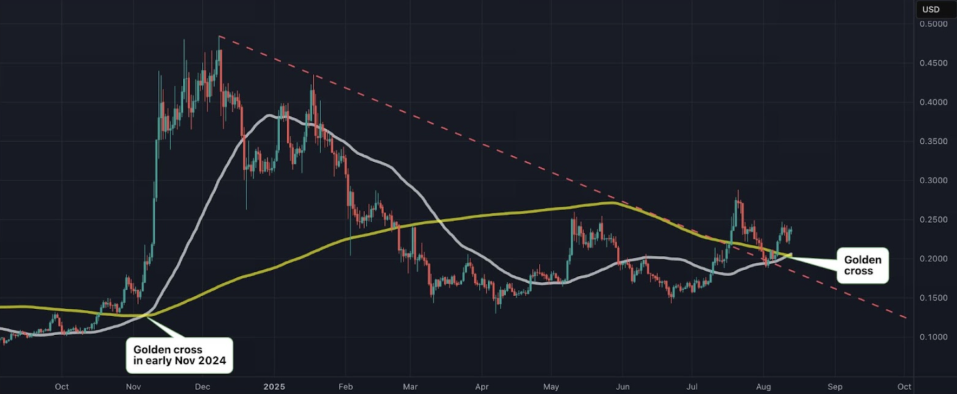 Instancias pasadas de señales de Golden Cross han mostrado resultados notables. Tras una señal el 6 de noviembre de 2024, el precio del altcoin aumentó más del 130% en cuatro semanas hasta alcanzar $0,46. Una señal similar el 22 de noviembre de 2023 resultó en una ganancia del 25% en el mismo período. Estos precedentes históricos sugieren una posible aceleración.