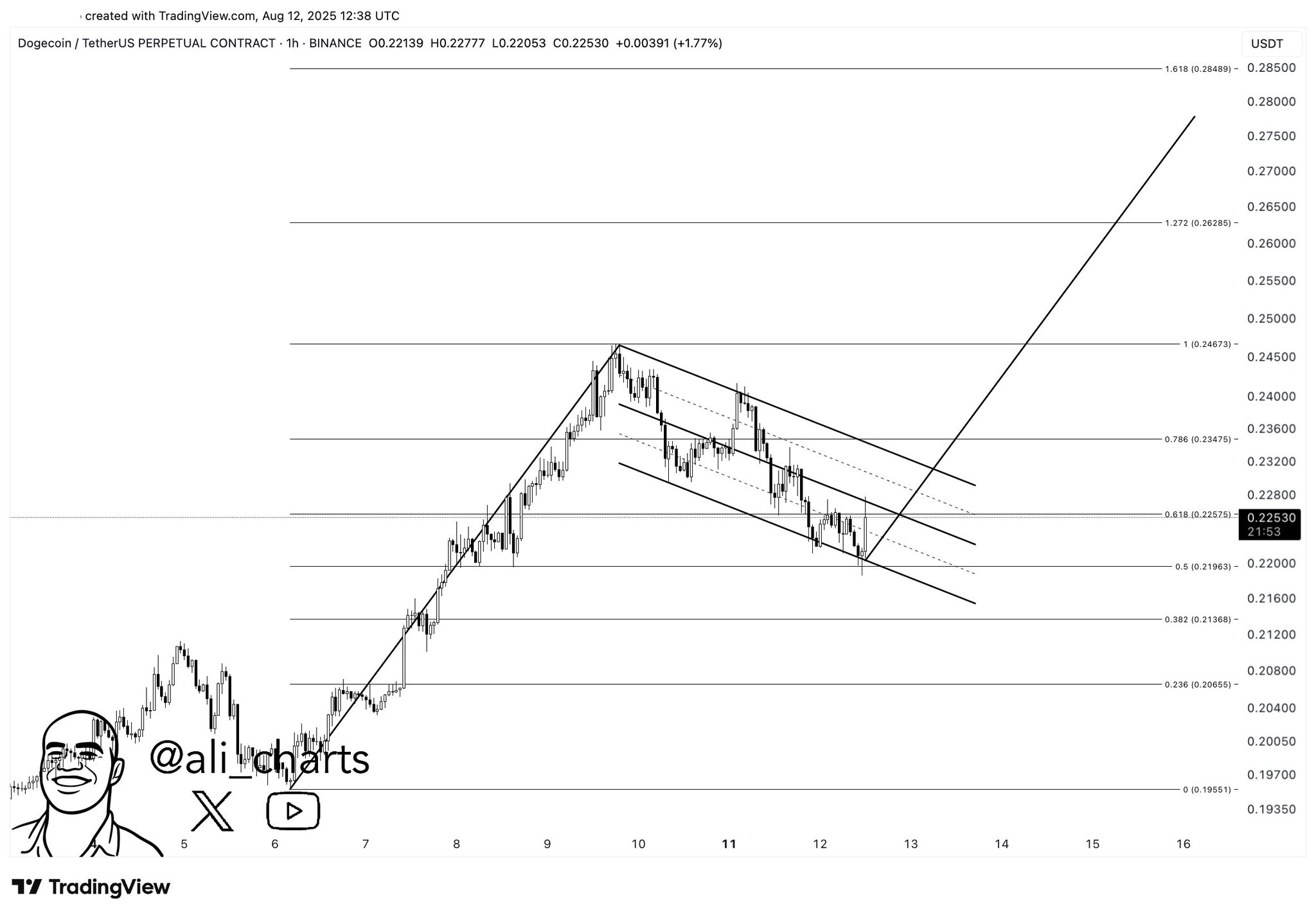 Dogecoin ha estado rondando los $0,22 durante un tiempo. A pesar de la actividad significativa de las ballenas, no ha habido un rompimiento definitivo. En el rally del mercado de altcoins de julio, muchas monedas vieron ganancias del 30-40%, pero DOGE se quedó rezagado. Sin embargo, la formación de bandera-pendón en el gráfico horario sugiere que el altcoin está consolidando fuerza, cumpliendo con las expectativas direccionales.