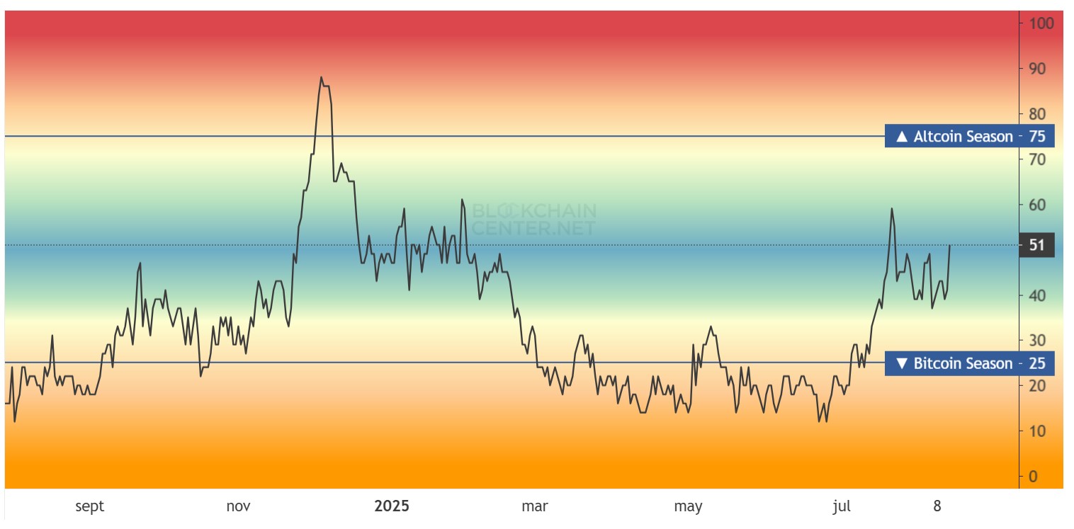 El retroceso en la dominancia de BTC y la subida de las criptomoneda coincide con un aumento en el índice de altseason de Blockchain Center, que se ubica, al cierre de este reporte, en 51%. Este indicador mide la proporción de criptomonedas, excluyendo stablecoins, que han tenido mejor rendimiento que bitcoin en los últimos 90 días. El criterio para considerar que hay una “altcoin season” es que al menos 75% de las 50 principales monedas superen el rendimiento de BTC en ese lapso.
