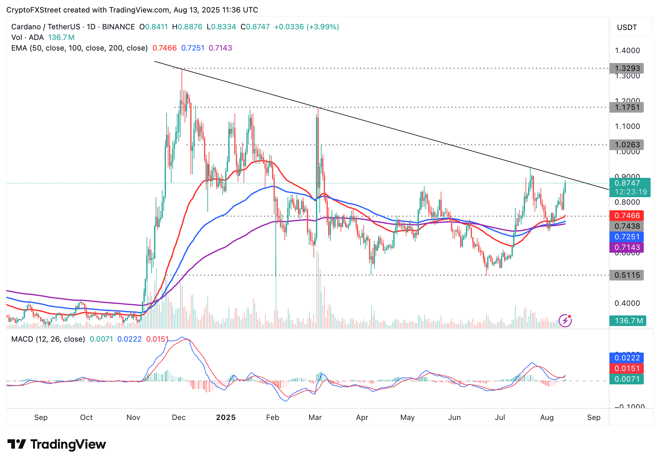 Cardano (ADA) ofrece señales alcistas el miércoles, respaldadas por un fuerte sentimiento en el mercado de criptomonedas en general. ADA se intercambia a alrededor de 0.87$, con un aumento de más del 4% en el momento de escribir este artículo.