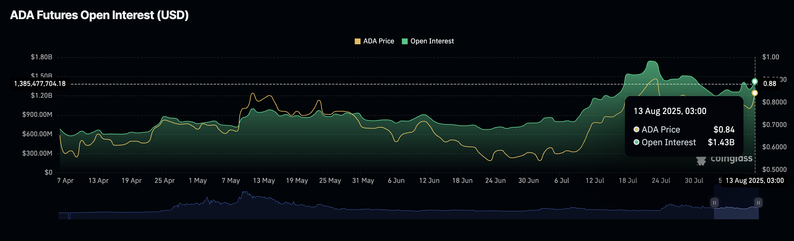 El mercado de derivados de Cardano refleja la perspectiva alcista en el mercado al contado, ya que el interés abierto de futuros (OI) se dispara a 1.43 mil millones de dólares el martes desde los 1.2 mil millones de dólares registrados el 3 de agosto, cuando ADA cayó y probó el soporte en 0.68$.